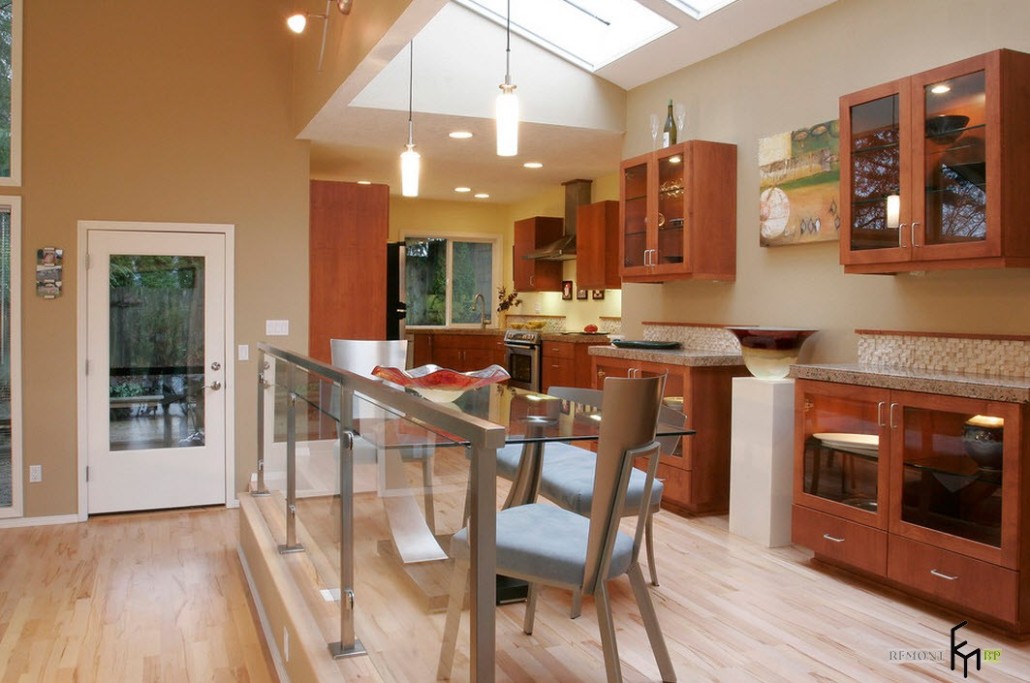 Что поставить рядом со стеклянной конструкцией? Это зависит от заданного вектора, так же как и цветое решение. Верно подобранные предметы в комплектации усилят впечатления от группы, и не нарушат стилистическую идею. Выбор стульев был бы намного проще, если бы не подстолье и тон мебельных фасадов.
