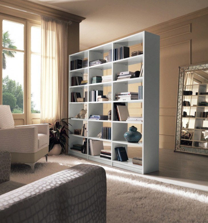 Пожалуй, наиболее часто стеллаж размещают в гостиной. Это помогает разделить ее на некие зоны. Кроме того, он выступает в роли декоративного элемента, та как на полках зачастую ставят различные рамки с памятными фото, интересные книги, небольшие вазочки с цветами и многое другое. При желании можно установить полностью открытый стеллаж, чтобы он пропускал свет и выполнял исключительно функцию перегородки. Смотрится это довольно оригинально.