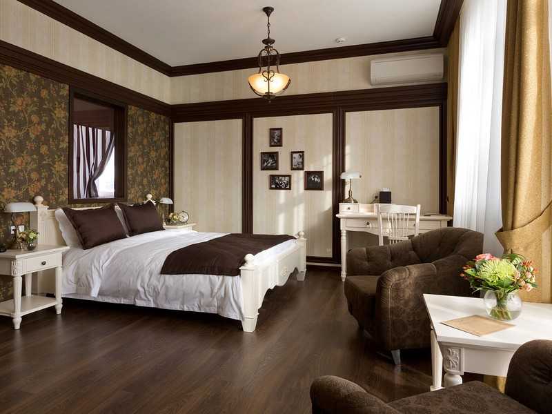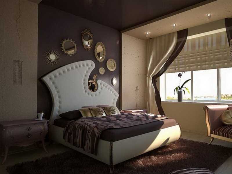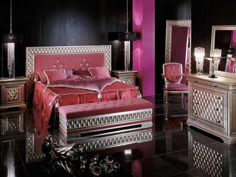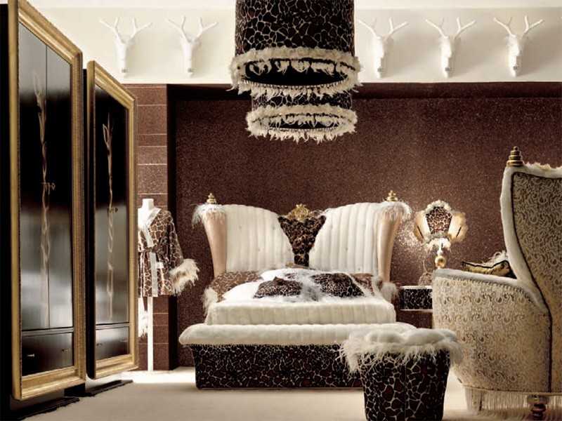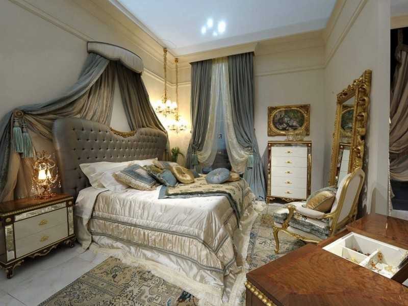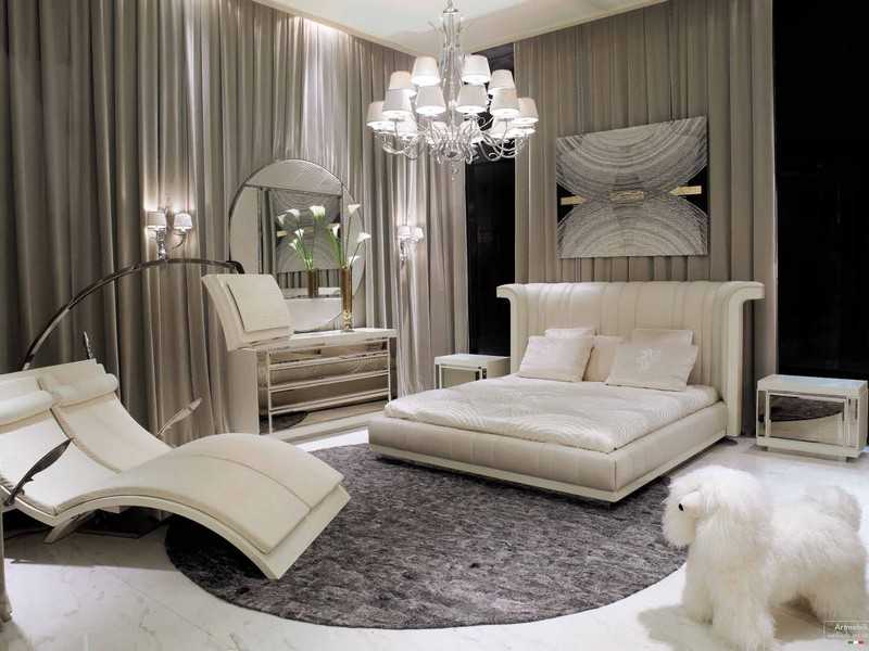 Относительно цвета – спальня может быть выполнена в белых, тепло-коричневых, серых, розовых, а также красных тонах. Рекомендуется применить контраст. Аксессуары и мебель не должны сливаться в одно целое, они должны выделяться. Наиболее эффектно выглядят интерьеры в сочетаниях черно-белого, шоколадно-бежевого, серо-черного, серо-синего и бело-бордового тонов. Обычно в отделке интерьера используются три оттенка, два из которых представляют фон (например, черно-белый), а один используется, как элемент роскоши (золотой, бронзовый или серебристый). Прекрасно, если в отделке также как и в декоре будет наличие элементов роскоши, например, ткани из шелка, легкая позолота или паркетный пол. Вообще, тканевые драпировки служат основным украшением спальной комнаты. Они придают особый романтизм и уют. Шторы могут быть шелковыми или атласными, перед кроватью – наличие однотонной натуральной шкуры белого цвета или же прикроватного коврика из искусственного меха с длинным густым ворсом. Кровать покрывается роскошным покрывалом с подушечками в тон мягкой обивки пуфика или стульев.