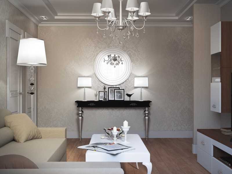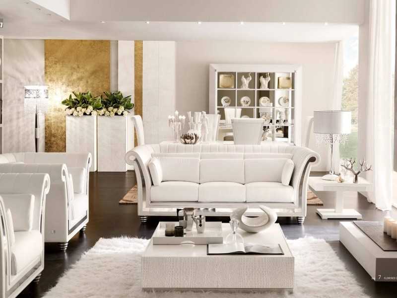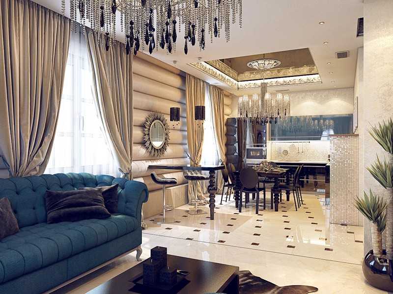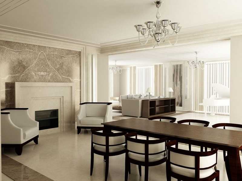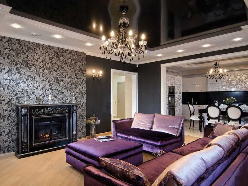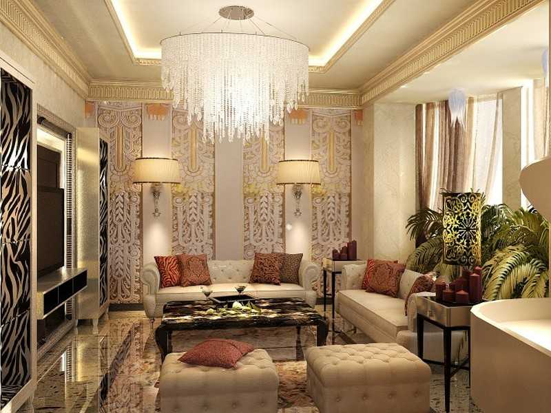 Относительно цветовой гаммы – преобладание темных оттенков, однако, допускается коричнево-бежевая гамма, создающая особое благородство интерьера. Но что касается пестрых цветов – это неприемлемо. Наиболее выигрышный эффект дает обыгрывание монотонной насыщенности в сочетании с контрастным рисунком. Особо приветствуется использование в гостиной инкрустированных стеклянных поверхностей, начищенного до блеска металла, а также полированного дерева, т.к. все эти атрибуты усиливают впечатление роскоши и благородства.