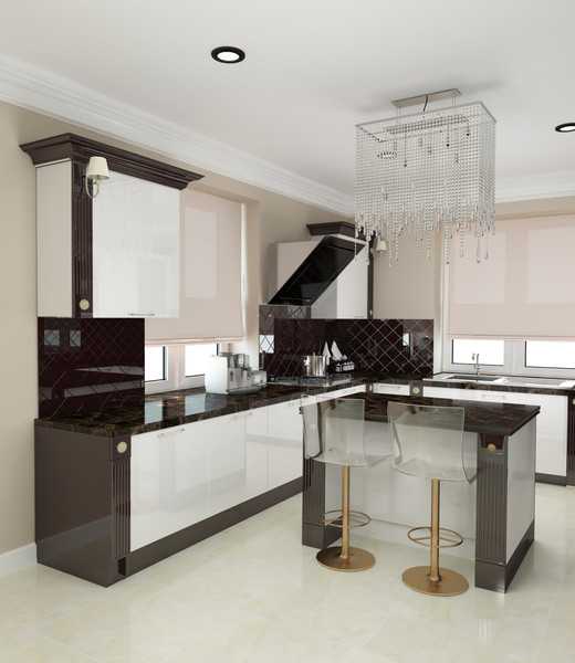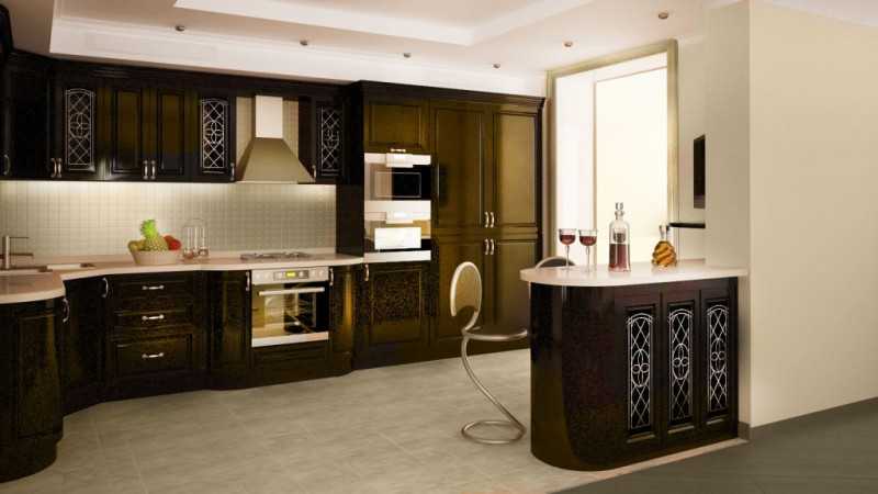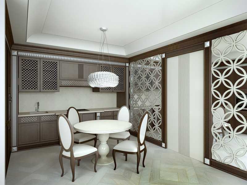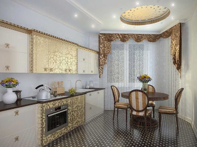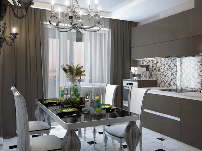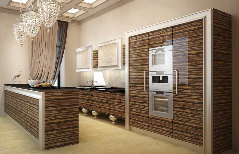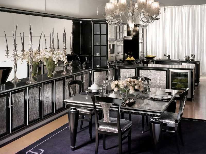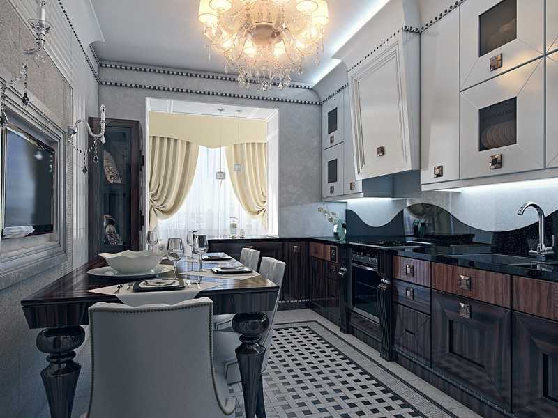 Как уже упоминалось выше, стиль Арт-Деко – это совмещением традиционного неоклассицизма и новаторского модерна. Как же все это проявляется в интерьере кухни? В первую очередь, своею оригинальностью. Поскольку данный стиль дорогой и достаточно яркий, то и дизайн кухни не является исключением, другими словами, незамеченным не останется. Во вторую очередь – эксклюзивностью в виде необычных антикварных вещей, например, предметов искусства. Относительно используемых материалов – применяются следующие: дерево (это основной) как полированное, так и инкрустированное или лакированное, металл (нержавеющая сталь и алюминий), натуральная кожа, стекло, а также плитка глянцевая (керамическая, из искусственного или натурального камня) и, конечно, текстиль (однотонный атлас или шелк, а также, ткань в полоску «под зебру»).