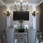 В отношении цветовой гаммы – безупречным сочетанием было бы черно-белое (это основная фишка Арт-Деко). Но возможны и другие сочетания цветов, например, белый с шоколадным, серебристый с черным и т.д. Но не следует забывать, что основная гамма – это цвета металла, земли, камня или натуральной кожи. Полосы неплохо применить для оформления зоны столовой, используя флизелиновые или текстильные обои одинаковой фактуры. А рабочий фартук можно выполнить из плитки, например, геометрической по принципу черно-белой мозаики. Другие цвета также могут добавляться, но в небольшом количестве и в приглушенных тонах (зеленый, голубой, золотой и красный).