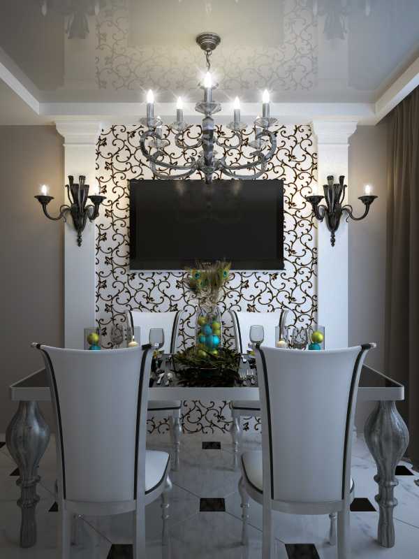 Еще одной традиционной особенностью стиля является ступенчатая форма, распространяющаяся как на узорчатую отделку стен, так и на мебель с модулями, расположенными на разных уровнях, и по высоте, и по глубине. Если позволяет площадь помещения, то хорошо было бы выполнить многоступенчатый натяжной потолок, если его затянуть глянцевой черной или белой пленкой и разместить множество подсветки. Наибольшего эффекта можно добиться, если сделать одну «ступеньку» в форме лепного бордюра, таким образом, акцентируя геометричность, присущую данному стилю. Также, как один из вариантов – оформить зону столовой фотообоями в виде многоступенчатых изображений пейзажей, домов или абстракции – лишь бы рисунки содержали четкие правильные геометрические формы.