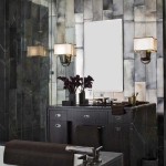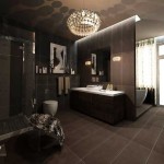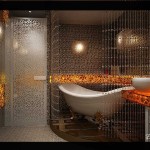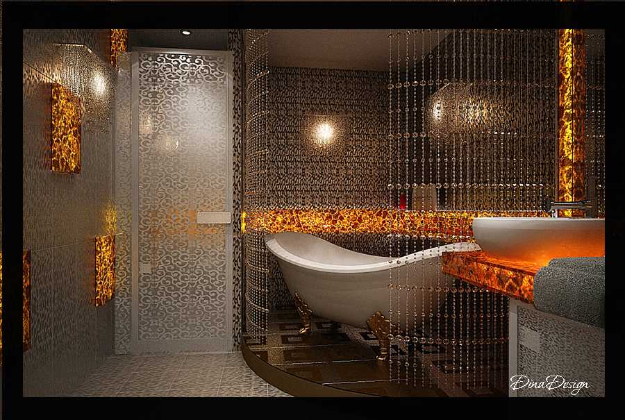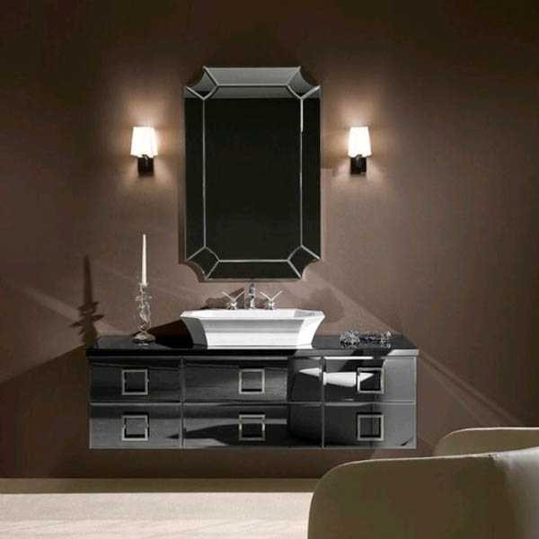 В качестве дополняющего интерьер аксессуара чудесно подойдет кованый фонтан или его имитация. Кроме этого можно использовать любую абстрактную скульптуру или же, скажем, яркую фотографию небоскреба. Еще один маленький, но значимый нюанс – не следует держать на виду такие вещи, как крема, зубные щетки или расчески, т.к. на открытой полке могут находиться всего лишь 2 – 3 блестящих флакона. Наличие светильников в ванной комнате, как и в других помещениях в стиле Арт-Деко, желательно в большом количестве, т.к. они должны напоминать огни мегаполиса. Идеально поместить сверкающую люстру в металле, размеры которой соизмеримы с размерами помещения. Желательно дополнить интерьер геометрической формы настенными светильниками. В таком случае, фантастическая яркость и освещенность ванной комнаты будет обеспечена. Ну и не следует забывать о естественном солнечном свете, если, конечно, помещение снабжено окном. Ведь лучи солнечного света создают непередаваемую игру света, обеспечивая чудесное настроение хозяевам, а также чудесное ощущение простора.