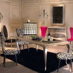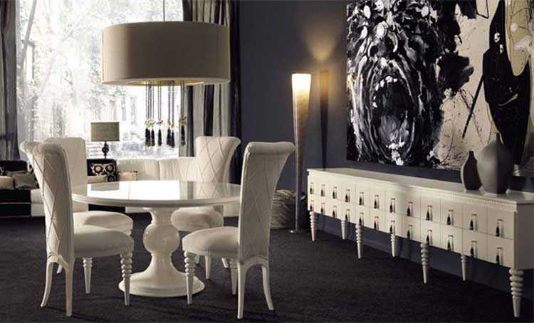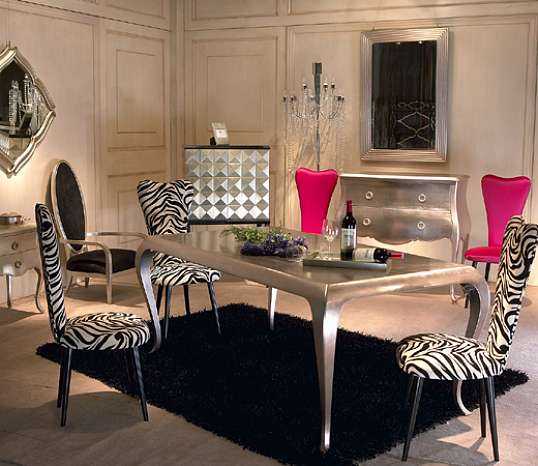 Очень значимый элемент и важный штрих Арт-Деко – это солнечные лучи (Sunburst). Лучи-полосы должны присутствовать повсюду: в обивке мебели, отделке, текстиле. Полосатые шторы до пола, люстра в виде вентилятора или же имитация шкуры зебры в мягком уголке – вполне достаточно будет одного или двух элементов «солнечных лучей». В отношении мебели, следует отметить, что обязательным условием является не допускать загромождения пространства, т.е. мебель должна быть функциональной. Обивка должна быть из бархата, атласа, кожи и велюра. Зону столовой в идеале превратить в изысканный столик по типу традиций лучших элитных ресторанов. Вообще, если говорить об идеальной кухне в стиле Арт-Деко, то в ней должна присутствовать мебель из ценных пород дерева, сделанная на заказ, или как вариант – отреставрированный антиквариат. Если такой возможности не представляется, то есть еще альтернатива дорогой древесине – двухцветный лакированный гарнитур, который может быть черно-белого, серо-голубого, красно-серого тонов и т.д.), т.е. сыграть на контрасте цветов и лакировки, что также «любит» Арт-Деко. Кроме этого, можно использовать мебель, отделанную нержавеющей сталью.