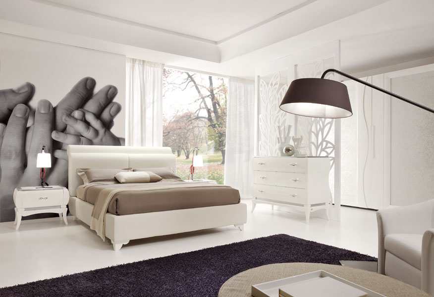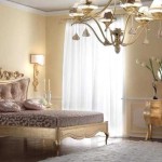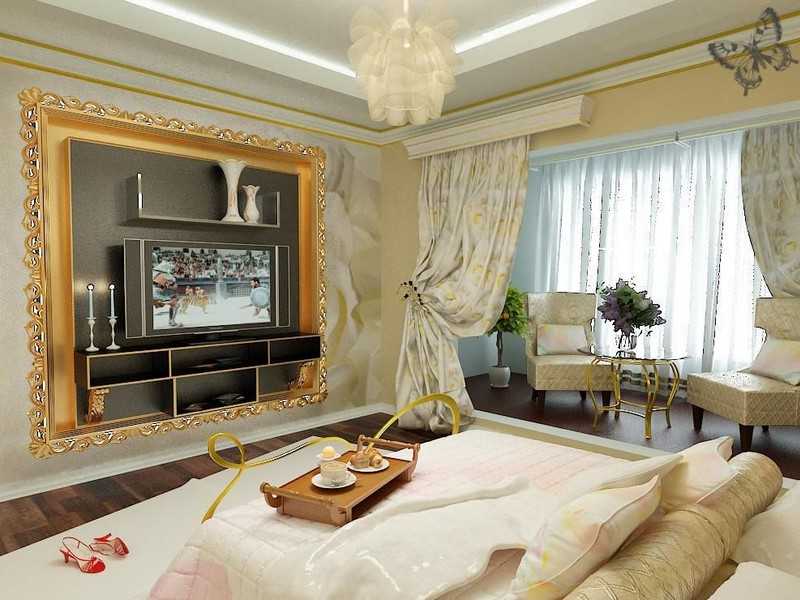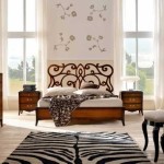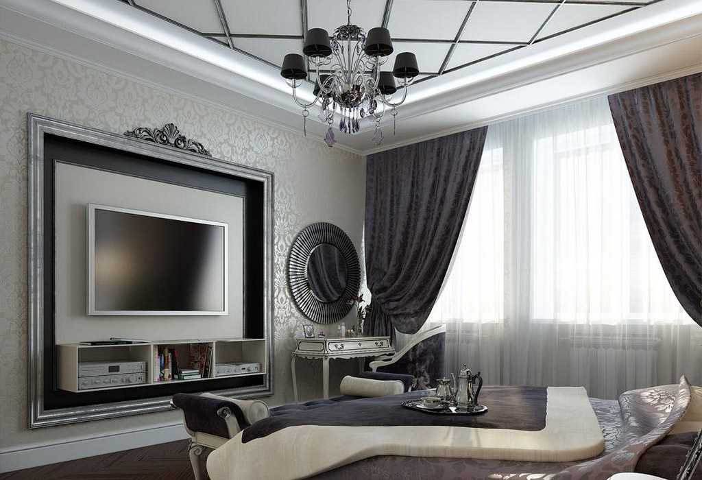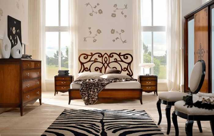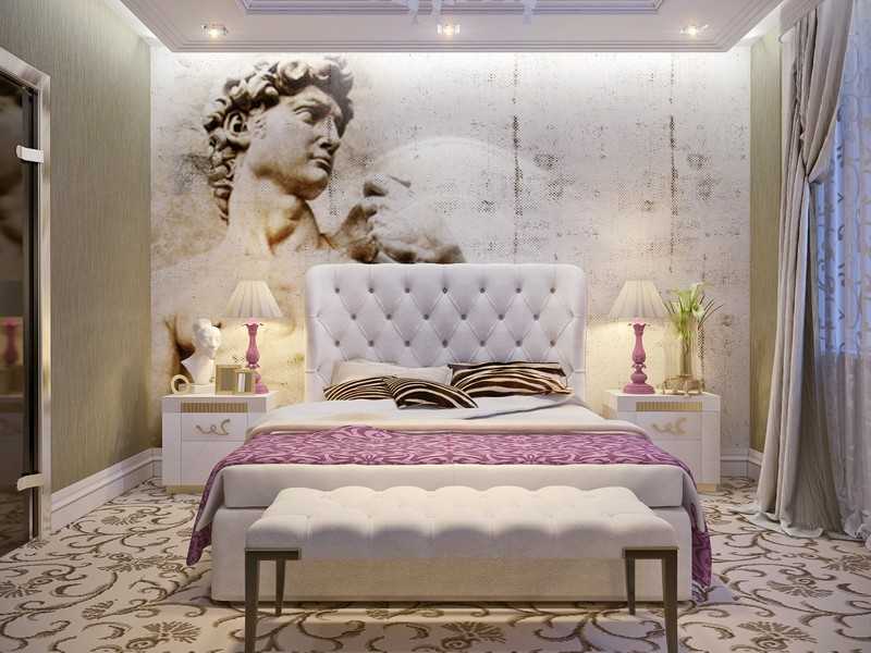 Стены спальни могут являться украшением интерьера сами по себе. Рисунки и орнамент – главный элемент в оформлении стен данного стиля, а также всевозможные коллажи, интерьерные наклейки или декоративная роспись. Однако, во всем нужна мера. Рисунок может быть фоновой оправой для мебели или же центральным акцентом интерьера, но должен иметь приглушенные неброские тона. Стиль допускает также наличие округлых форм: овалы, волны, круги. Если в стене имеется ниша, то при помощи гипсокартона можно ей придать форму эллипса и поместить там, к примеру, туалетный столик или телевизор. Но в таком случае подобную форму необходимо повторить или при отделки потолков, напольного подиума, или же дверных проемов. Кстати, что касается потолка, то на нем не плохо было бы разместить лепнину, например, в виде обрамления люстры. На стенах допускаются картины, правда, в небольшом количестве, чтобы не произошло перенасыщение интерьера разными мелкими предметами.
