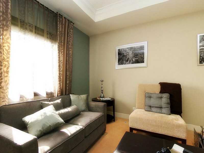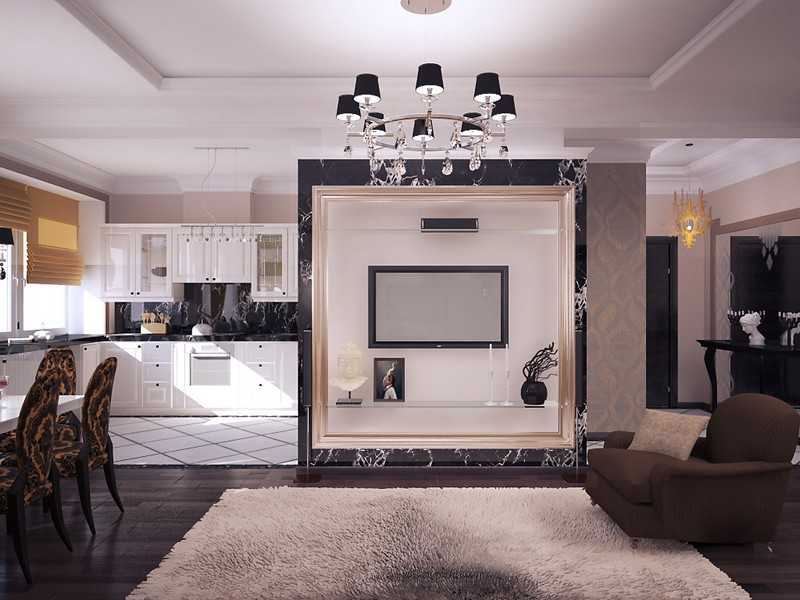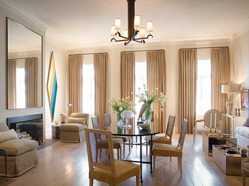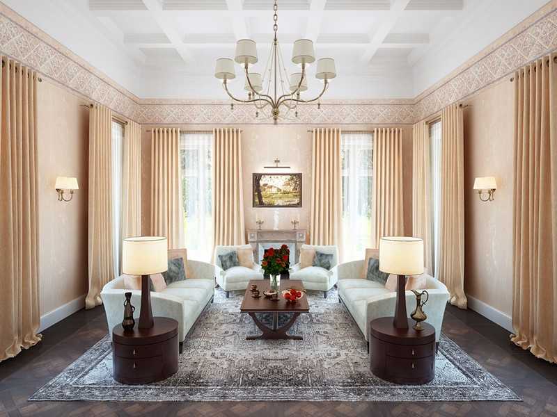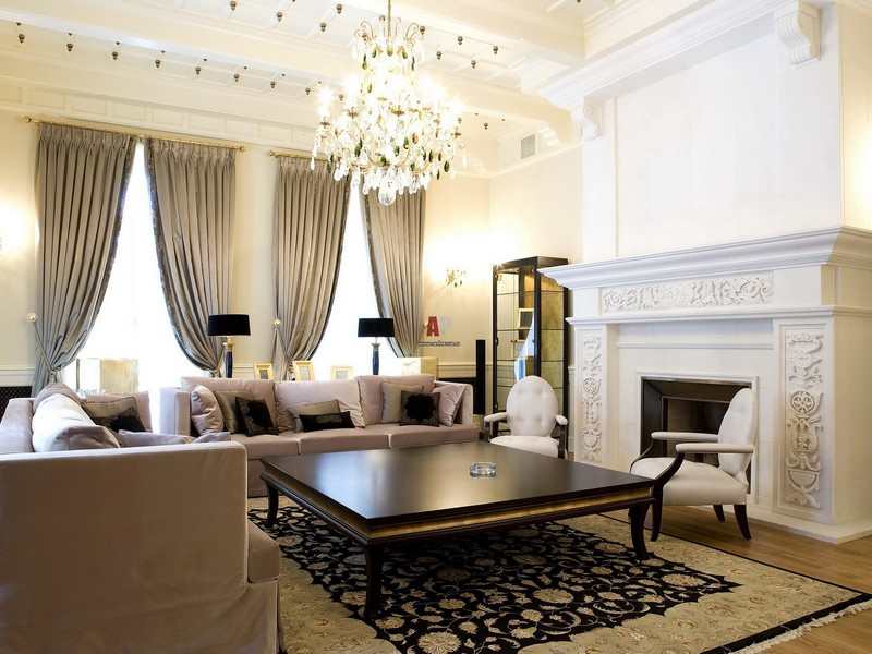 Стены гостиной обычно служат приятным ненавязчивым фоном для роскошной стильной мебели и прочих предметов интерьера. Очень часто они просто окрашиваются в однотонный цвет. Хотя, деликатные вкрапления в виде орнаментов других цветов также возможны. Главное, что надо помнить – цветовая гамма для стен и пола должна обязательно быть мягкой, а вот мебель на ее фоне – темной и даже почти черной.