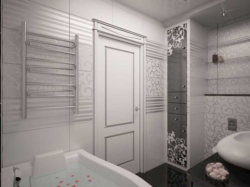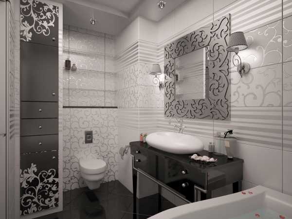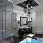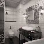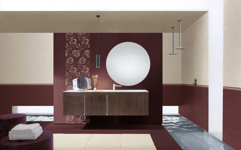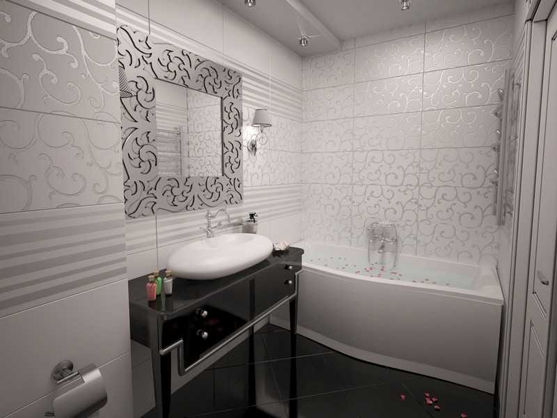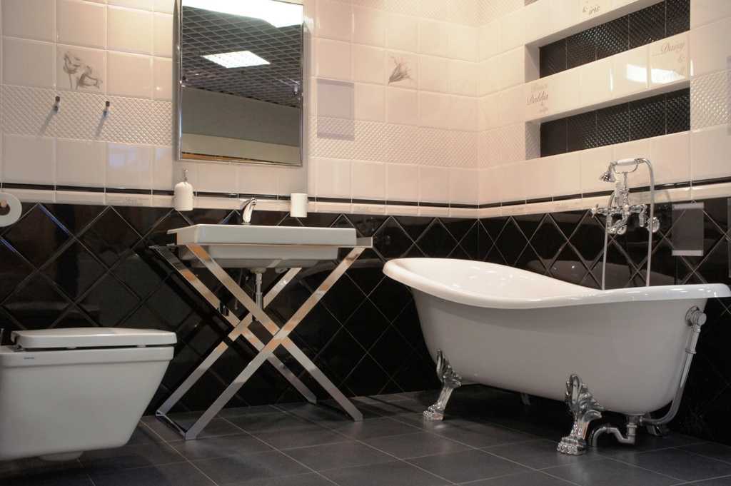 В отношении цветовой гаммы ванной комнаты можно отметить явное выделение ярких радикальных тонов, основой которых служат белый и черный. Также приветствуется вкрапление красного и золотистого. Зеркала предпочтительнее выбирать крупных размеров, не страшно, если они будут занимать всю стену. Зеркало в свою очередь может иметь геометрическую форму, как может быть и без окантовки или заключенное в витиеватую раму.