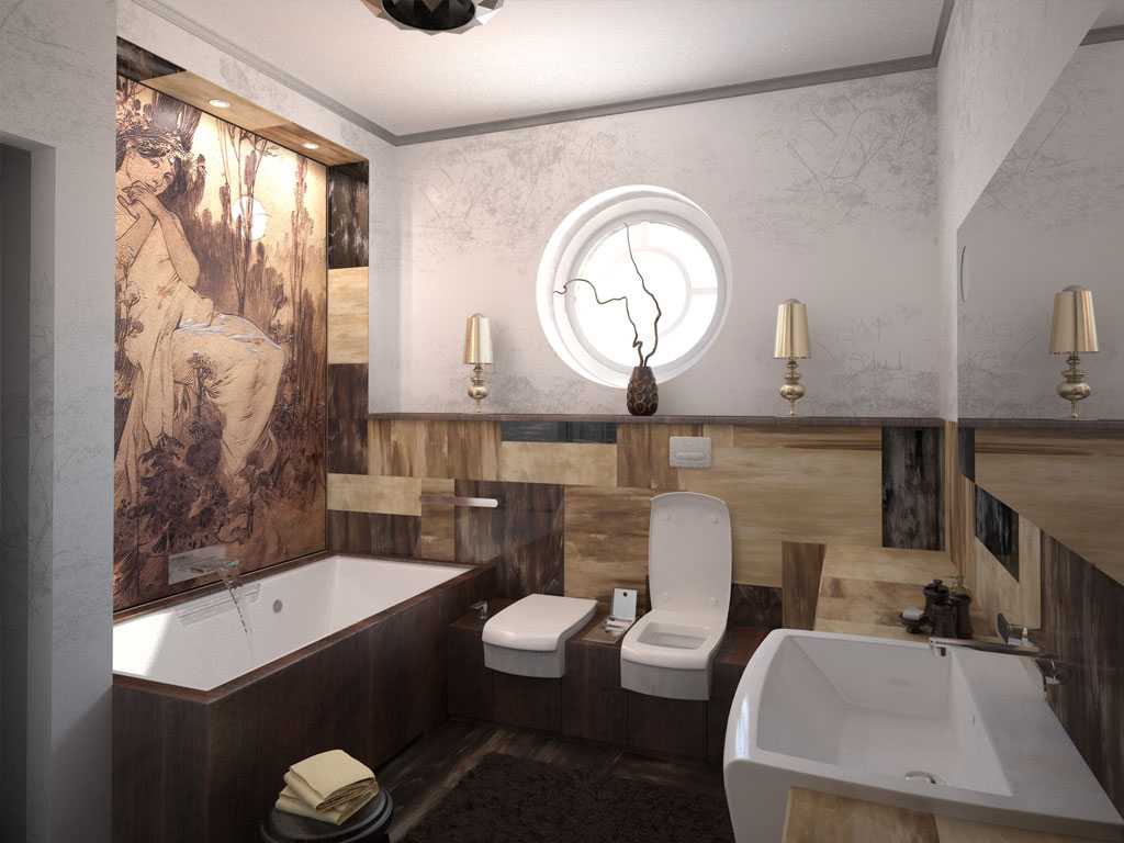 Ванная в стиле Арт-Деко, прежде всего, ассоциируется с массивностью, монументальностью, роскошью, эффектностью, а также с геометрическими рисунками, четкостью и графичностью форм и смелыми сочетаниями, в том числе и незаконченными композициями, что свойственно особенностям данного стиля. Поскольку Арт-Деко включает в себя и восточные, и русские, и африканские, и греческие детали, то здесь возможно несовместимое, например, соседство этнической утвари с хромированными современными деталями. На сегодняшний день роскошь стала утонченной, лишенной излишней помпезности за счет проработанности дизайна, а также фактуры и сочетания материалов, о чем свидетельствует современное прочтение Арт-Деко. В силу свойственной стилю провокативности, душ в ванной комнате может быть выполнен, например, в виде головы оленя. Относительно используемых материалов, можно отметить явное преобладание мрамора, стекла и стали.