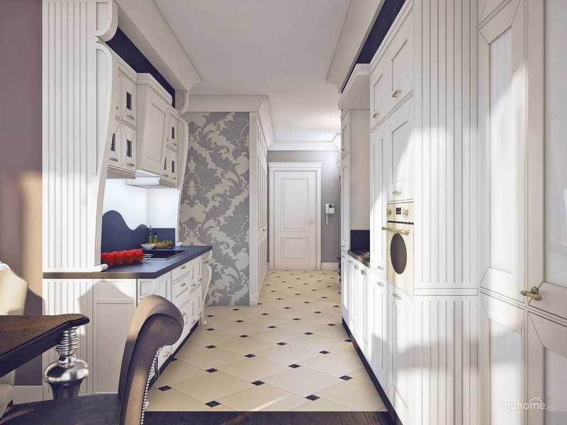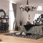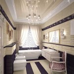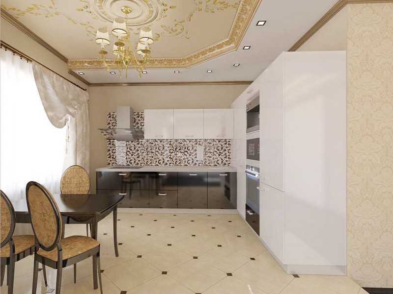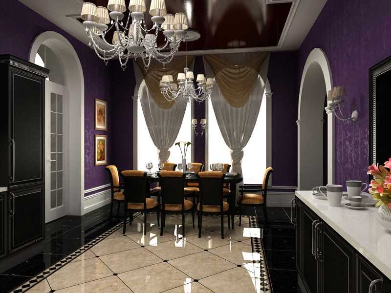 Вот потолок не желательно отягощать мрачными черными узорами. Прекрасным решением будет светлая рельефная плитка с орнаментом. Также потолок может быть просто окрашенным в светлый тон, в таком случае его лучше заключить в оригинальную раму с орнаментом, соответствующим узору на стенах. Но даже простой побеленный потолок можно украсить люстрой из хромированной или нержавеющей стали.