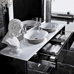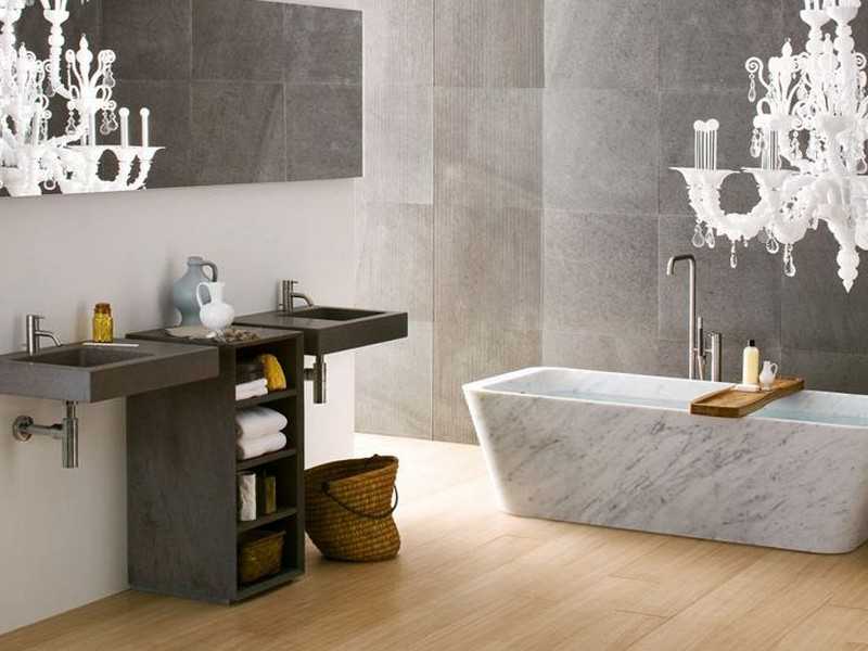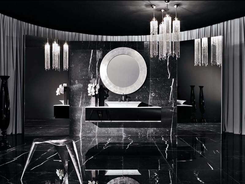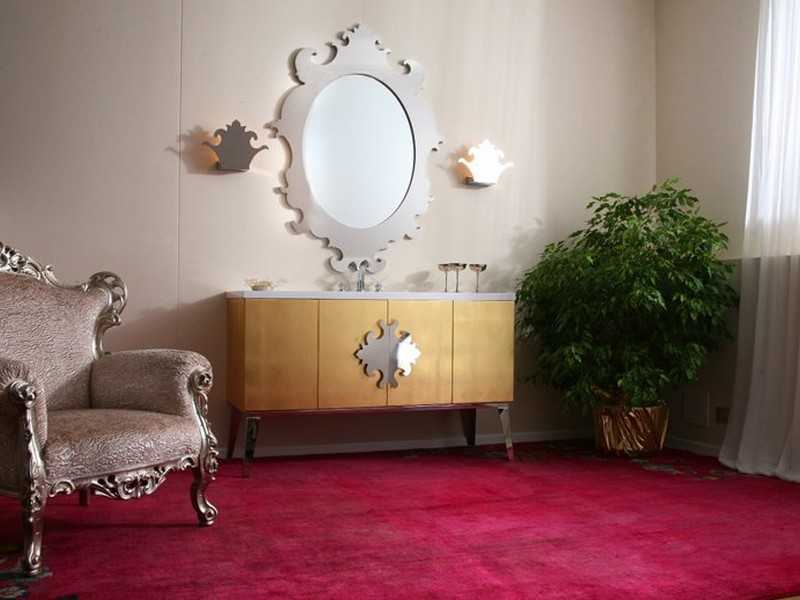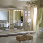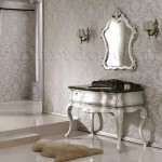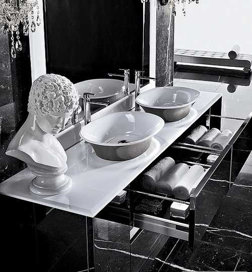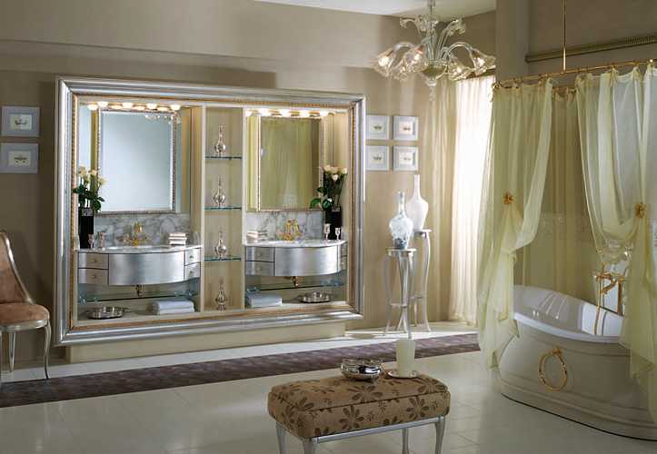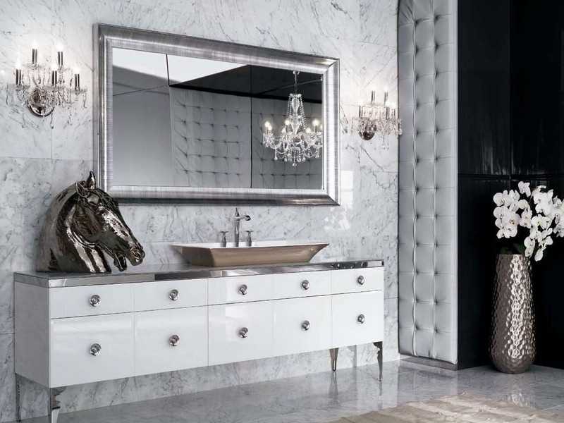 Относительно мебели для ванной комнаты – подразумевается наличие монументальной, но вместе с тем, изящной в результате преобладания металла и стекла. Самое утонченное украшение ванной – это блестящие стальные полочки. Неплохо было бы разместить добротный шкаф, по возможности, поражающий размерами своей высоты или ширины, если, конечно, позволяет площадь помещения. Цвет может быть темный или слоновой кости. Вообще, для мебели часто используются такой материал, как розовое и красное дерево, кленовый массив, бамбук и другие редкие породы деревьев.