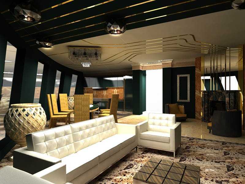 В современных гостиных в стиле Арт-Деко гармонично сочетаются геометрические фигуры с закругленными фасадами, а мебель обычно из ценных пород деревьев сочетается со стеклянными вставками и металлическими ручками. Стиль предоставляет огромное поле деятельности относительно воплощения разных задумок. Могут быть использованы любые рисунки, будь то африканские орнаменты, узоры кубистов, предметы авиации или дизайн с автомобильной тематикой, т.к. интерьеры в этом стиле состоят из мозаики стилей и эпох. В качестве декоративного материала используется дерево ценных пород, кожа (в том числе крокодила, акулы и морского ската), полудрагоценные камни, слоновая кость, бамбук и т.д. Таким образом, экстравагантные материалы значительно помогают выразить всю гамму чувств, тем более, что гостиная в стиле Арт-Деко – это настоящий центр эстетики. Достаточно широко нашло свое применение сочетание стекла с металлом, а двери, межкомнатные перегородки, каминные принадлежности и лестничные перила украшаются с помощью сварного железа.