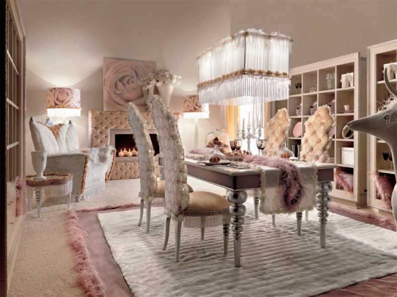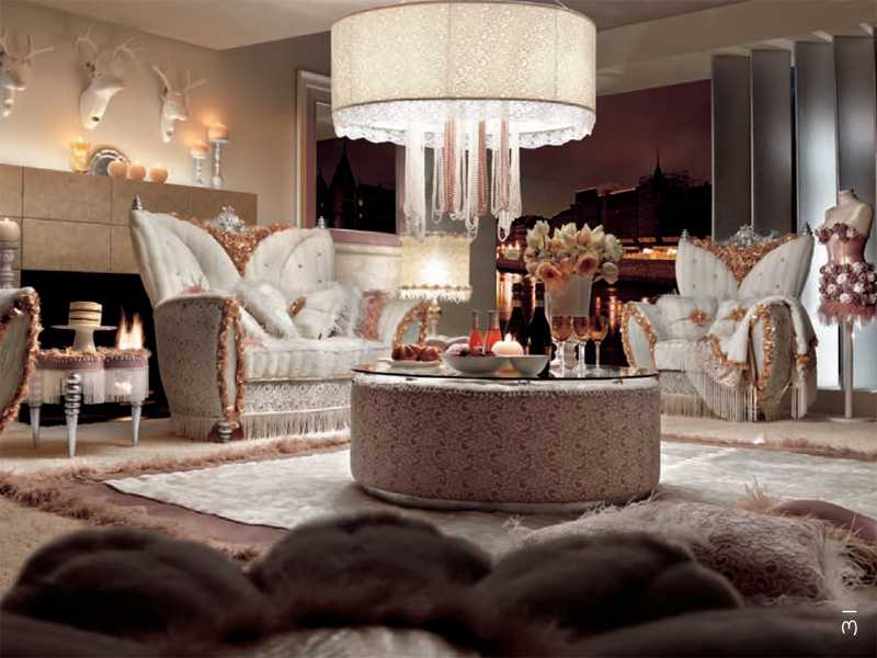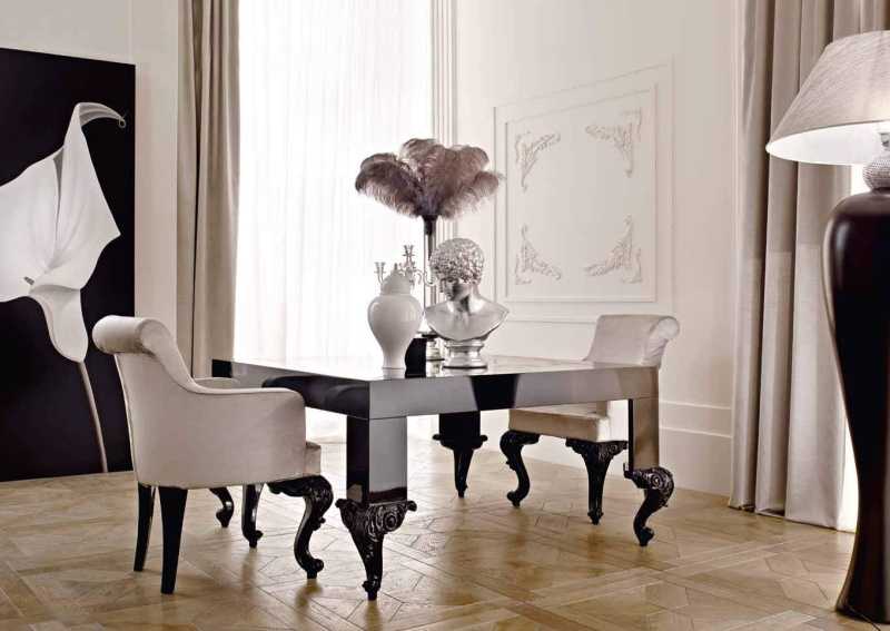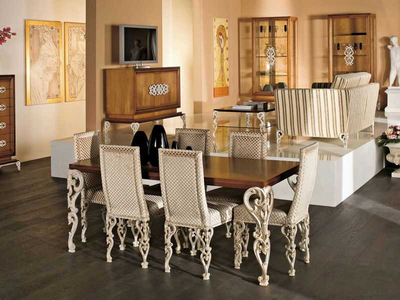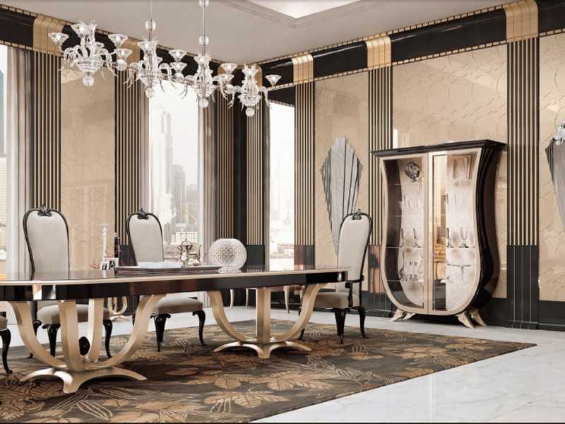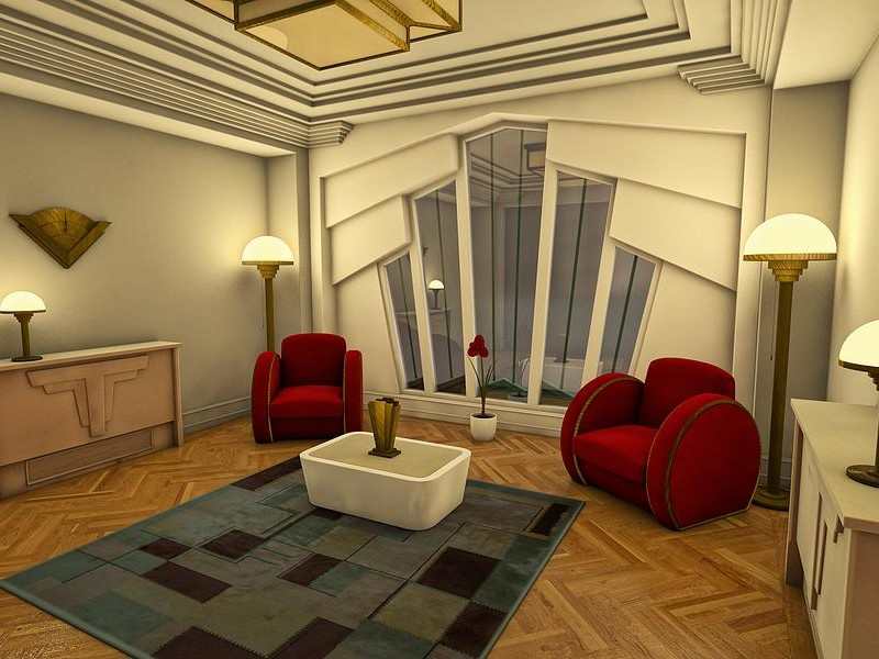 Мебель в гостиной Арт-Деко также должна быть роскошной, лучше, если она изготовлена вручную из экзотических пород дерева. Но в любом случае, любой предмет все равно дополнительно декорируется. Форма мебели также необычна, например, сиденье у кресла может иметь форму трапеции, а в обивке могут прослеживаться египетские или восточные орнаменты, одним словом, сочетание несочетаемого. Особенно уместно использование шикарных столов с инкрустированными столешницами, а также больших стульев и кресел типа королевского трона. Но не следует забывать о том, что стиль сам по себе очень изящен и легок, в связи с чем актуальны формы зигзагов, волн или лебединых шей. Кстати, стиль имеет еще одно название – «художественный». Наиболее выигрышная комбинация для мебели – это использовать темно-красную или бордовую древесину в сочетании с белой натуральной кожей, мрамором или стеклом.