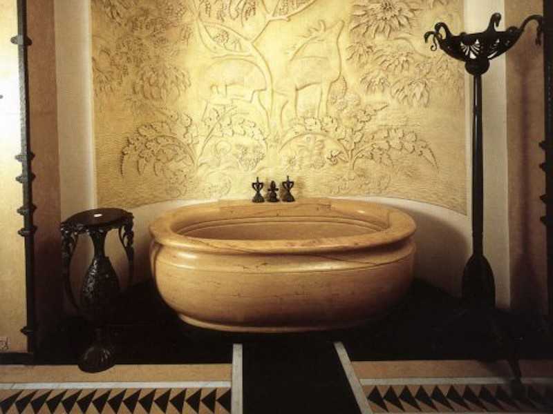 Стены в ванной комнате лучше всего сделать глянцевыми цвета слоновой кости с применением этнических зигзагов черного или коричневого цветов. Можно также использовать узор, имитирующий змеиную кожу или шкуру леопарда. В качестве материала прекрасно подойдет керамика, которая в том числе может быть рельефной. Альтернативный вариант керамики – это цветной пластик. Наиболее эффектно выглядят стены под мрамор, а также загадочная и ассиметричная мозаика. Очень часто стены украшаются лепкой или росписью, а при наличии в стене ниш, их заполняют античные вазы или изделия из камня. Но вместе с тем, общая картина ванной комнаты в целом должна выглядеть лаконичной и строгой, т.е. лишние вещи не допускаются. Взамен им лучше одна, но дорогая и эксклюзивная статуэтка.