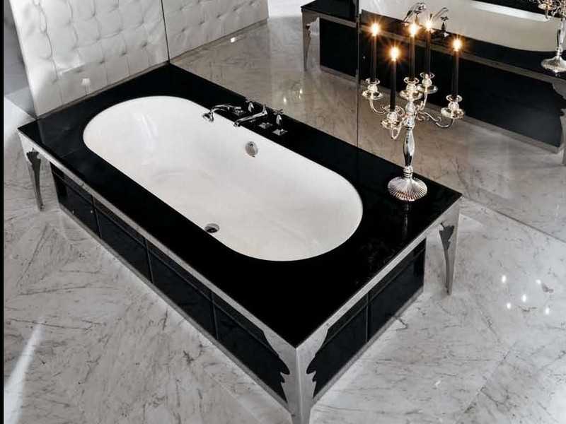 Пол в ванной Арт-Деко рекомендуется выполнить из большой мраморной плитки белого и черного цветов, выложив ее замысловатыми прямоугольными или произвольной формы узорами. Шахматный пол из керамической плитки также неплохо будет смотреться.