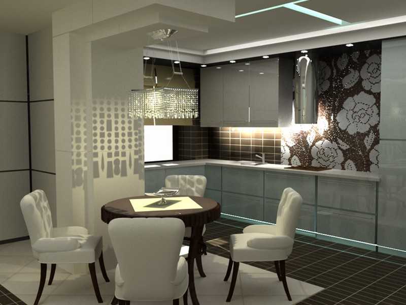 Полы желательно выполнить лакированным паркетом, хотя, конечно, для кухни такая поверхность не совсем практична. В связи с этим, лучшая альтернатива – напольная плитка (мраморная или имитация любого другого натурального камня). Также можно использовать линолеум, имеющий геометрический рисунок. Не следует забывать и об этнических нотках, которые также должны присутствовать, например, в виде картин с пейзажами или же черно-белых фотографий, помещенных в тонкие деревянные или металлические рамки. Или же декорировать интерьер при помощи пальм или экзотических цветов. И еще один нюанс – светильников должно быть достаточно много, чтобы обеспечить хорошую освещенность помещения.