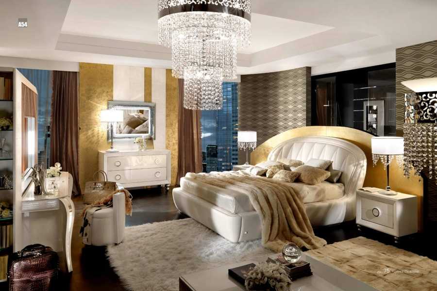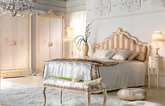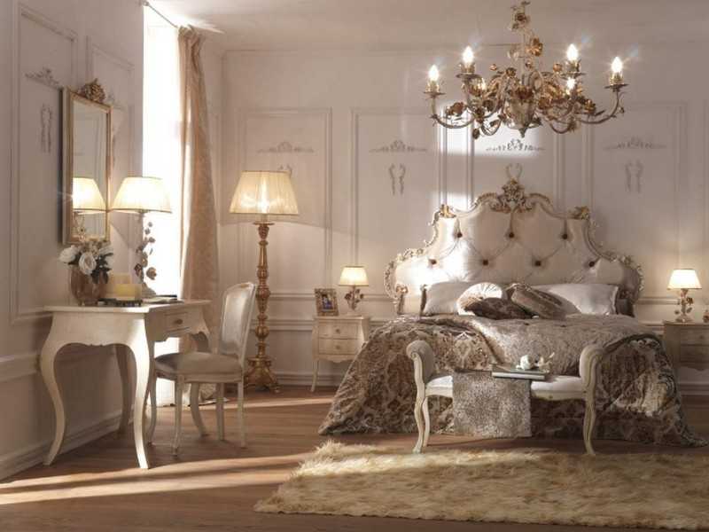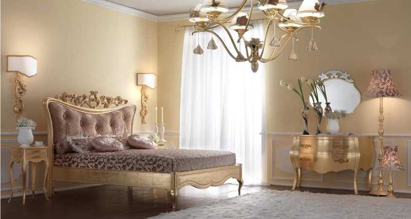 Подсветка спальни должна быть многоуровневой, как минимум должны присутствовать: центральная люстра из хрусталя или разноцветного стекла, лампы у туалетного столика и торшеры. Для освещения ниш можно дополнительно использовать светодиодную подсветку.