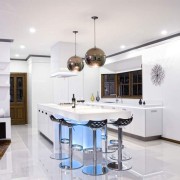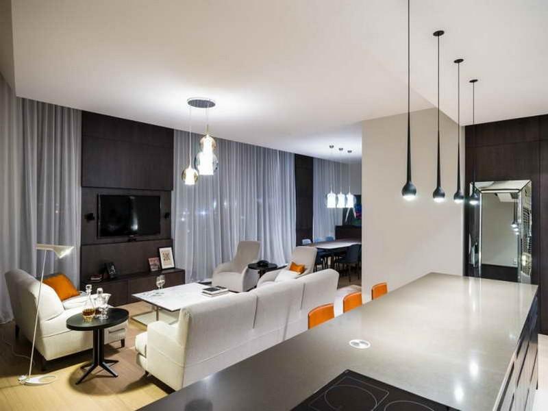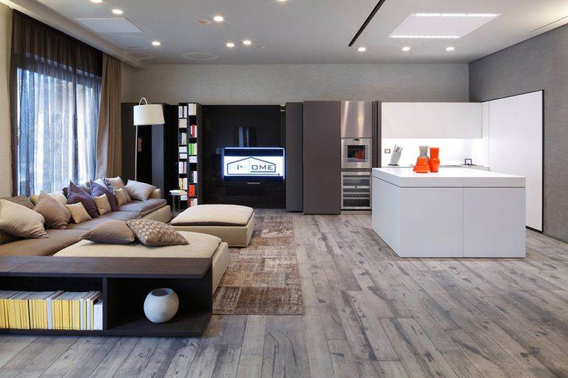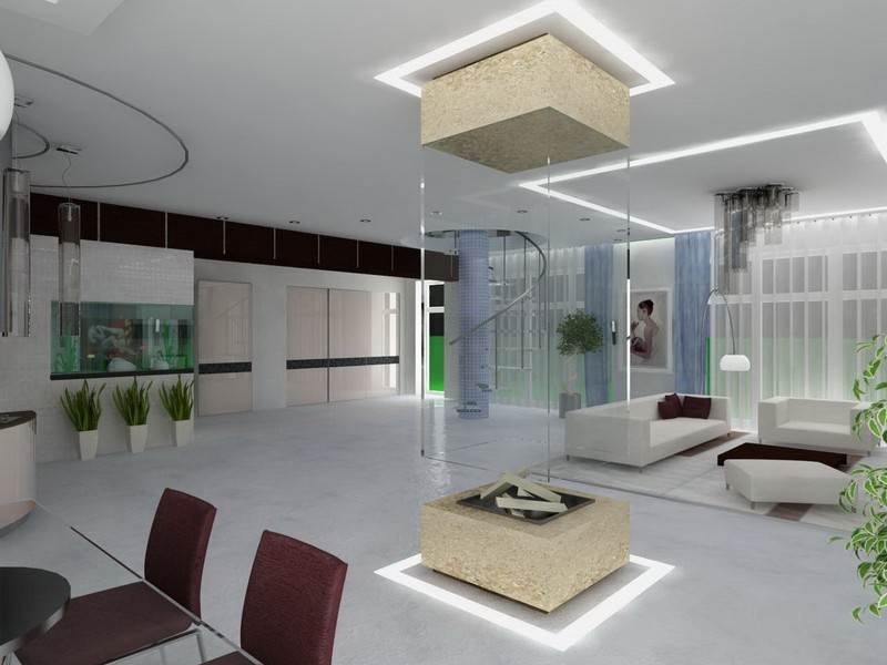- Обилие источников света, причем не только на потолке, но и в полу и на стенах, поскольку они наполняют помещение светом, создавая ощущение простора и легкости.