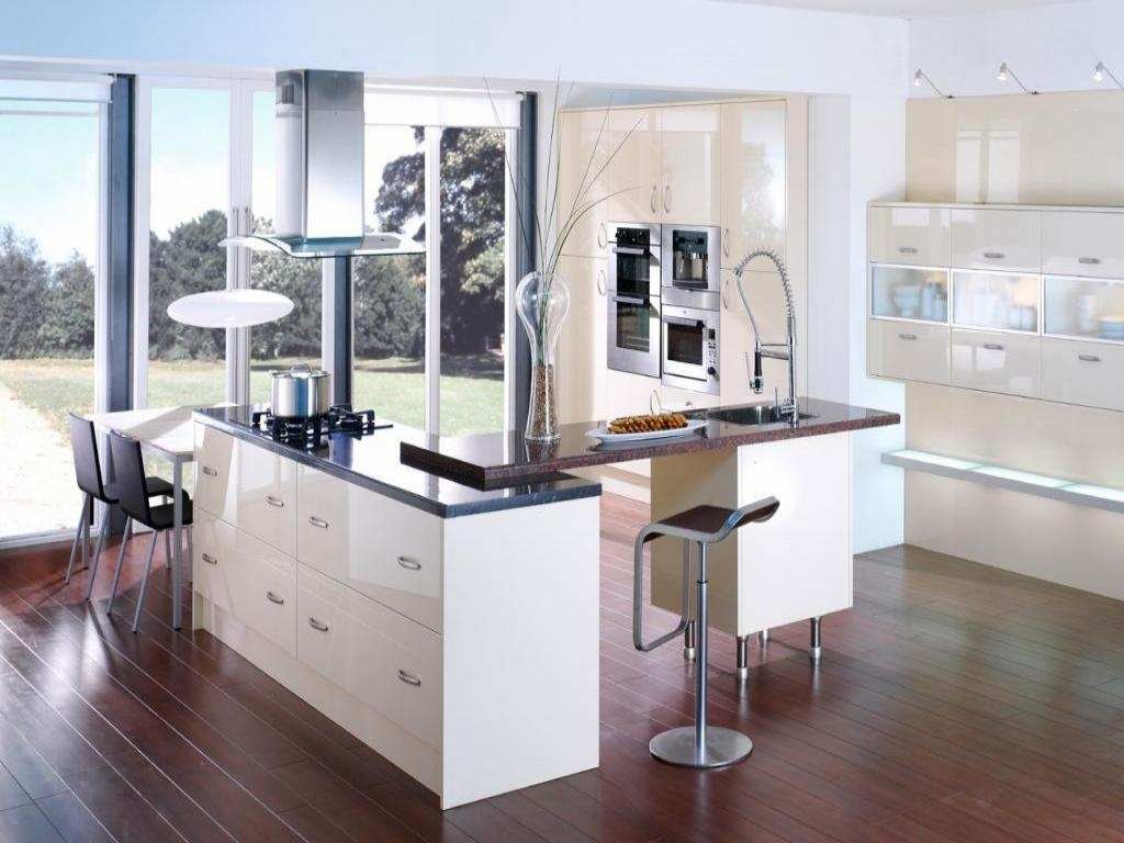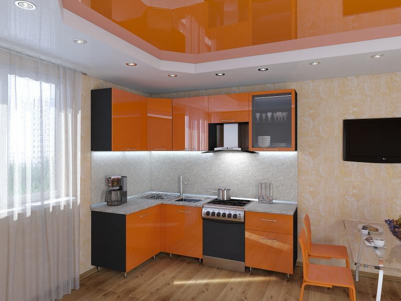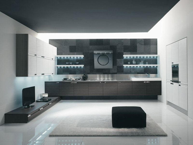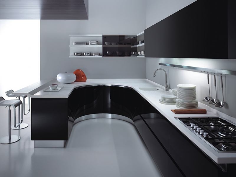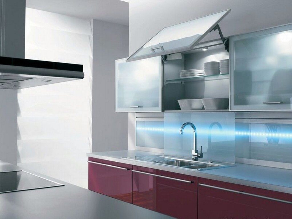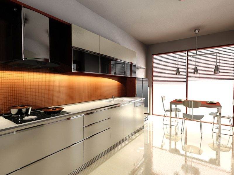 Целесообразно упомянуть о мебели и материалах для кухни, выполненной в стиле с необычным названием Хай-тек. Алюминий, пластик, нержавеющая сталь и прочие сплавы – неотъемлемая часть ее дизайна. Также не обойтись и без прочного стекла или прозрачного пластика. Архитектурные особенности кухни этом стиле предусматривают наличие больших окон различных форм, которые иногда могут быть равны ширине стены.