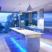 - Авангардные светильники, хромированная и стеклянная мебель с интегрированной подсветкой.