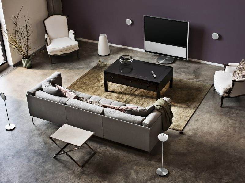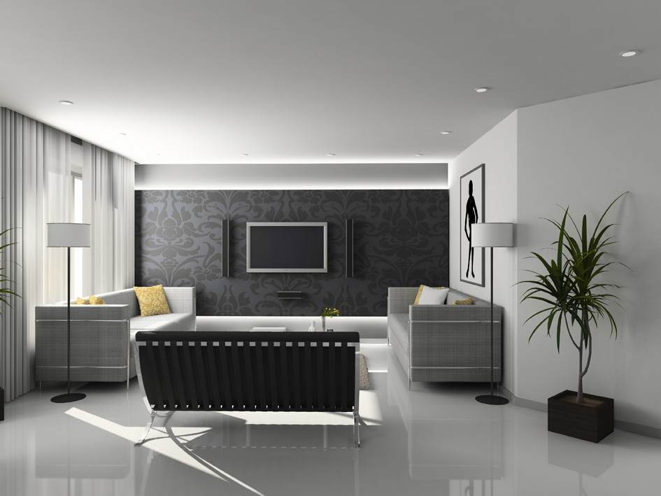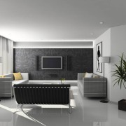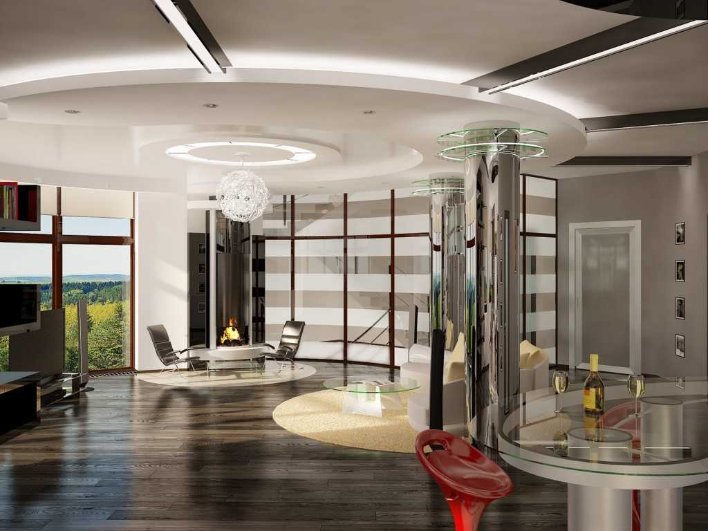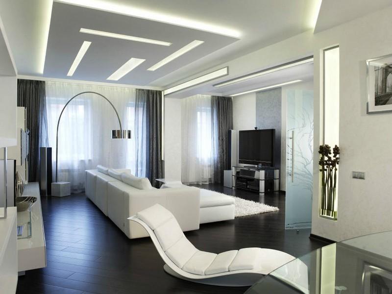 На этапе выбора напольного покрытия при разработке гостиной в стиле, называемом Хай-тек, рекомендуется отдавать предпочтение следующим материалам: плитка, линолеум, паркетная доска или оригинальный глянцевый ламинат. Для отделки стен зачастую применяются флизелиновые обои, которые спустя некоторое время при желании можно будет покрыть матовой или глянцевой краской. Ввиду того, что в данном интерьере преобладает урбанистический мотив, отличным решением станет облицовка стен крупным камнем с ровной фактурой, штукатуркой или кирпичом. На некоторые стены можно установить зеркальные полистирольные панели. Потолок гостиной, выполненной в Хай-тек может быть как реечным и металлизированным, так и глянцевым натяжным или же подвесным необычной формы или размера.