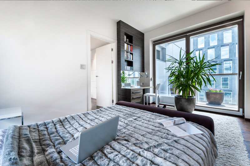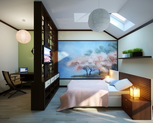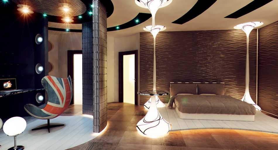 Стены зачастую окрашиваются в спокойные цвета, а при необходимости украшаются необычными абстрактными панно или монохромными фотографиями. Для окон оптимальным вариантом станет использование темных штор или горизонтальных жалюзи. Обычно для интерьера спальной комнаты подбирается многоуровневое освещение, позволяющее самостоятельно регулировать не только оттенок, но и яркость ламп.