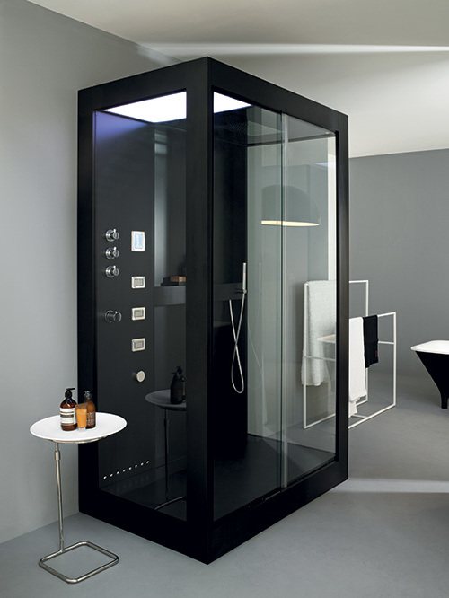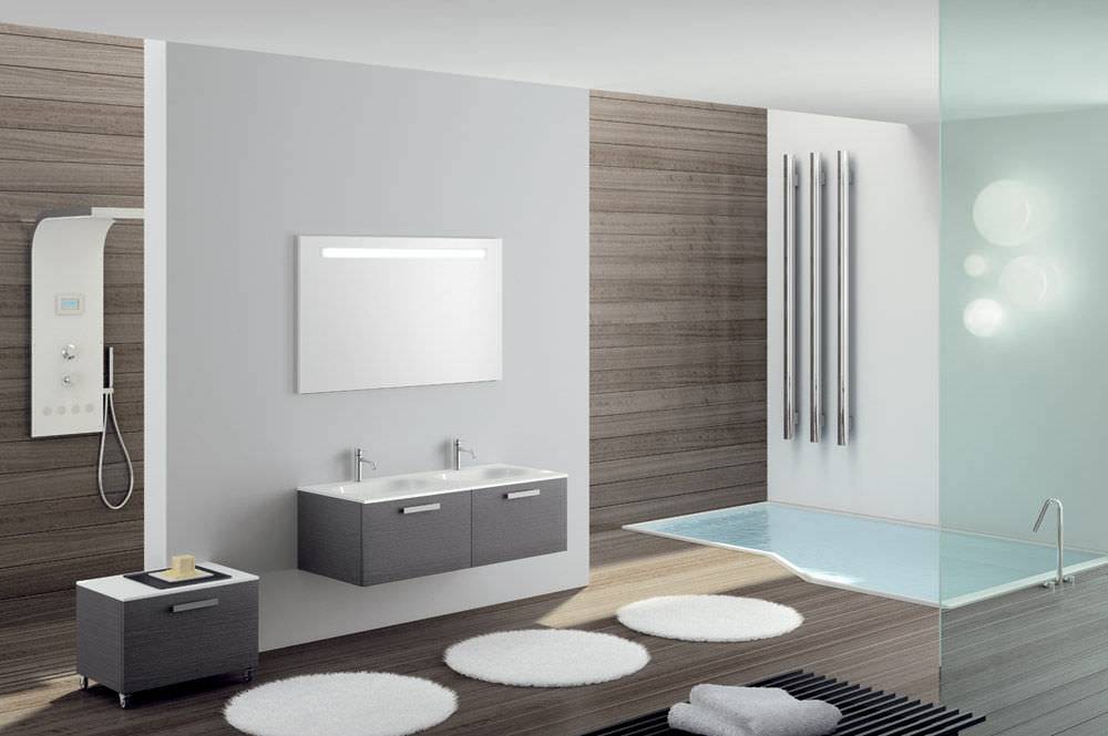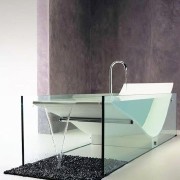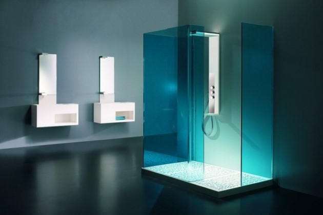 Посредством открытых стеллажей можно не заботиться приобретением мебели – полки для ванной, изготовленные из цветного или матового стекла, прикрепленные к стенам крепежами «пеликанами» или другой фурнитурой, позволит стилистически объединить различные зоны ванной комнаты, создавая в них общий и целостный дизайн. Большое количество зеркал позволит соблюсти пропорции и стиль интерьера.