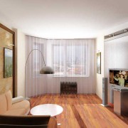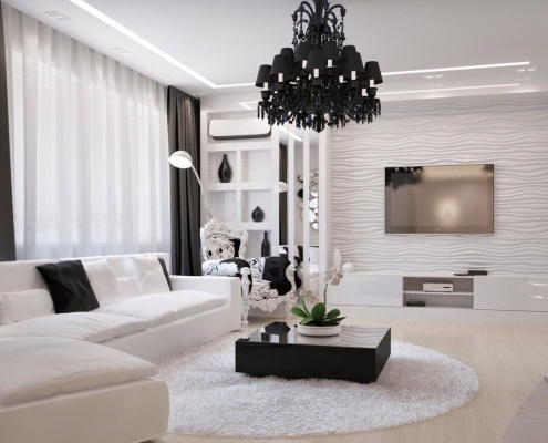 При оформлении окон не уместными будут классические портьеры или гардины. Предпочтение обычно отдается римским шторам или жалюзи. Также можно поиграть на контрастах – синий, ярко-оранжевый, зеленый и пр. При оформлении стен допустимо применять габаритные зеркальные вставки, монохромные фото, постеры с графическими рисунками. Пол можно застелить длинноворсным ковром спокойного оттенка, который поможет несколько смягчить строгое пространство, внеся в техногенный антураж немного тепла и уюта.