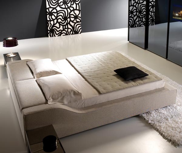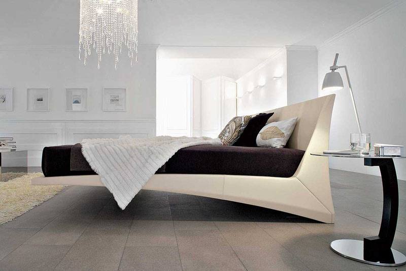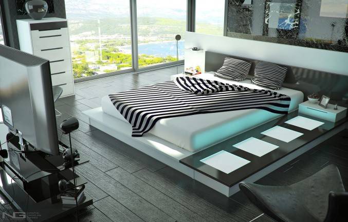 Особое внимание стоит уделить кровати, поскольку именно она является смысловым центом каждой спальни. По своим конструкционным особенностям они мало чем разнятся друг от друга, поскольку у каждой имеются основание, спинка, ножки и пр. И если основание кровати в большинстве случаев скрыто, то спинка всегда видна. Именно по данной причине признаки Хай-тек стиля, как правило, отображены в изголовье кровати – будь это незатейливый кованый орнамент, четкие геометрические формы или интегрированный светильник.