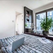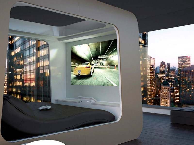 Для того чтобы подчеркнуть особенности интерьера, можно повесить на стену плазменный телевизор или поместить на столик ноутбук. Относительно используемых материалов, важно отметить, что в данном случае предпочтение отдается стеклу, пластику и металлу. Не следует пытаться перегрузить спальню мебелью. Важно подбирать мебель наиболее простую как по форме, так и по внешнему виду. Минимализм и свободное пространство только приветствуются.