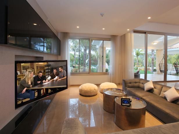 Не менее уместными в интерьере гостиной в стиле под названием Хай-тек порой могут быть сюрреалистические панно и картины, металлические статуэтки и прочие изделия из стекла. Если правильно подобрать кашпо, можно разместить несколько экзотических декоративных растений. Окна в данном случае можно украсить римскими шторами, светлыми жалюзи или легкими серыми, белыми шторами-нитями.
