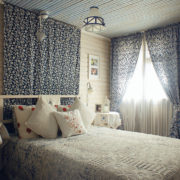 Потолок чаще всего выполняют в белом цвете, изредка разбавляя его оттенками коричневого. Это делается для того, чтобы интерьер в целом не смотрелся аляповато и потолок гармонировал с дизайном комнаты. Популярны натяжные и многоуровневые натяжные потолки. Они помогают рассеять свет и спрятать источники освещения. Выгодно смотрятся массивные деревянные балки, однако не стоит размещать их в маленьких помещениях, такое решение, всё же, лучше применять в просторных комнатах с высокими потолками.