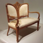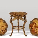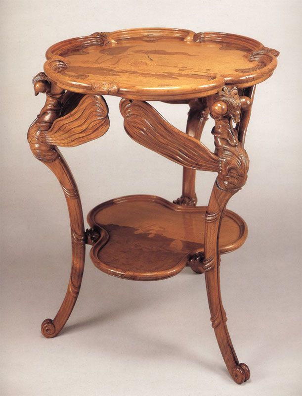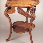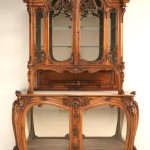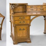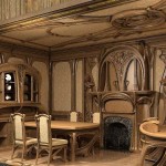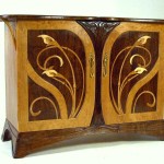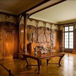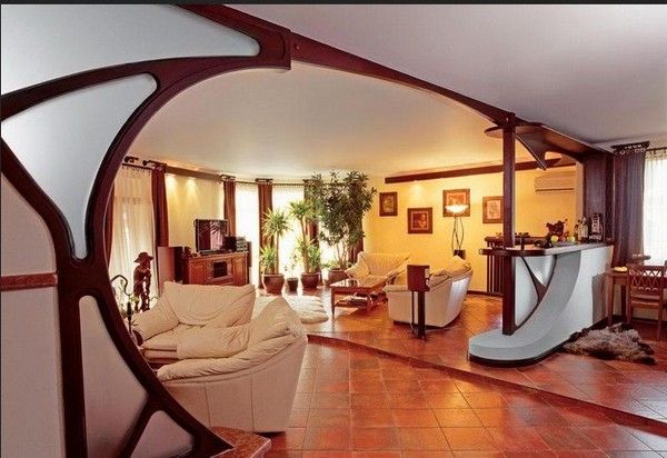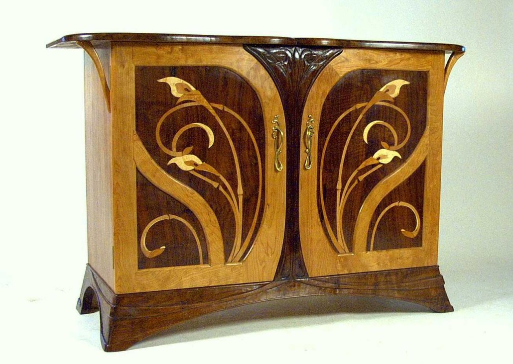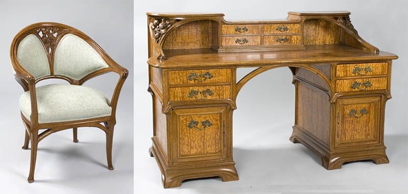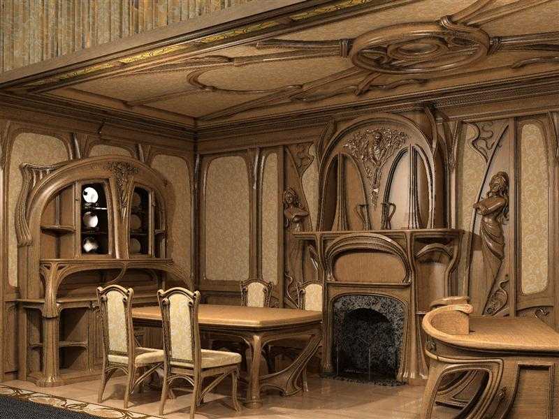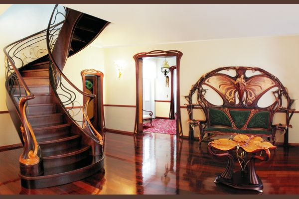 Дерево максимально подходит для стилистики, однако необходимо учесть ряд обязательных правил. Во-первых, цвет и текстура дерева, из которого изготовлена мебель, должна повторять оттенок других деревянных элементов декора. Так же следует помнить, что в классическом исполнении стиля любая мебель имеет обтекаемые природные формы с несимметричным рисунком. Самый простой способ – выбрать мебель близкую к классическому стилю, отличающуюся причудливой формой. Модерн очень гибкий стиль, располагающий к экспериментам. Деревянная мебель может иметь формы, которые ближе к стилю минимализма. В таком случае необходим очень выразительный декор, витиеватые пестрые узоры или декорирование стеклом. Часто мебель используется как часть цветовой гармонии. В таком случае основная крупная мебель побирается в тон к фоновому цвету, а уравновешивает её пестрый контраст с мелкими элементами меблировки по гамме соответствующие самому яркому цвету интерьера.