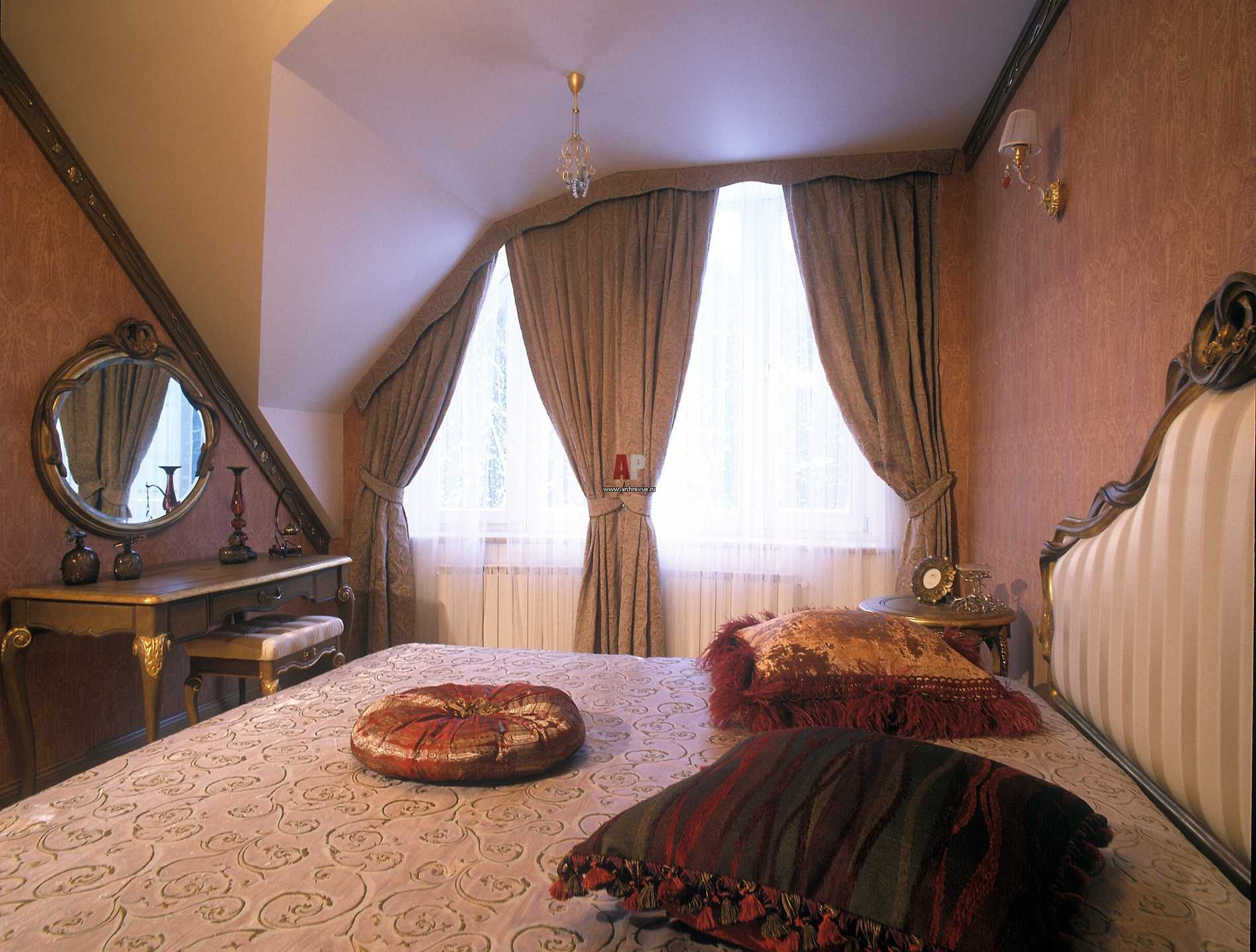 Дополнение аксессуарами – минимальное. Тонкая тюль, цвета стен в союзе с грубыми шторами на несколько тонов темнее дополнит оконный проем. На стенах можно расположить одну или несколько картин, соответствующие стилистике спальни. Не сохраняя симметрию, на прикроватных тумбах располагаются различные вазы, статуэтки или светильники неопределенной формы.