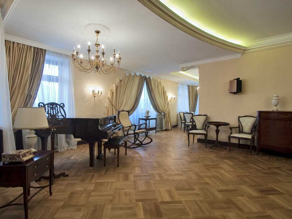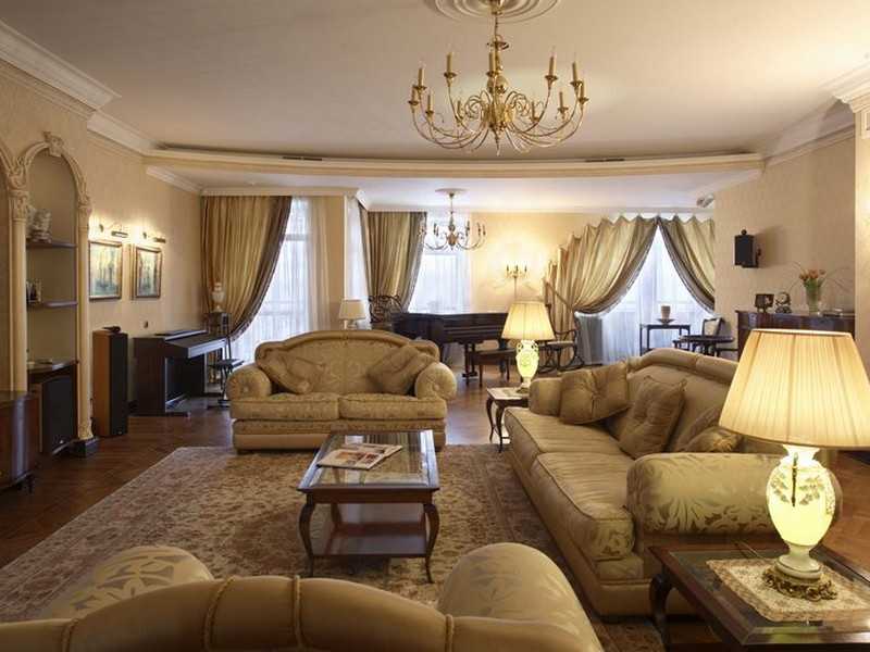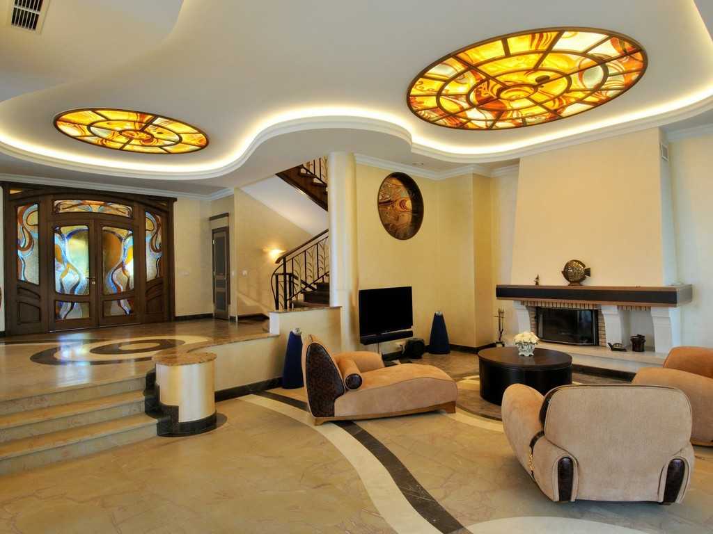 Потолок оформляется без резких переходов и контраста со стенами. Одноуровневые потолочные конструкции из гипсокартона максимально подходят, поскольку их можно окрасить в один тон со стенами, а так же максимально удобно расположить осветительные приборы. Удачно будет смотреться конструкция натяжного потолка, дополненная рассеянным освещением. Самый простой вариант облицовки – окрашивание потолка, на котором можно разместить крупную люстру в стиле модерн. Существует вид облицовочных материалов для потолка, который идет в разрез с требованиями оформления гостиной в стиле модерн. Потолочные панели ПВХ, все виды фактурной или цветной облицовки, а так же касетоны не используются при оформлении гостиной в данном стиле.