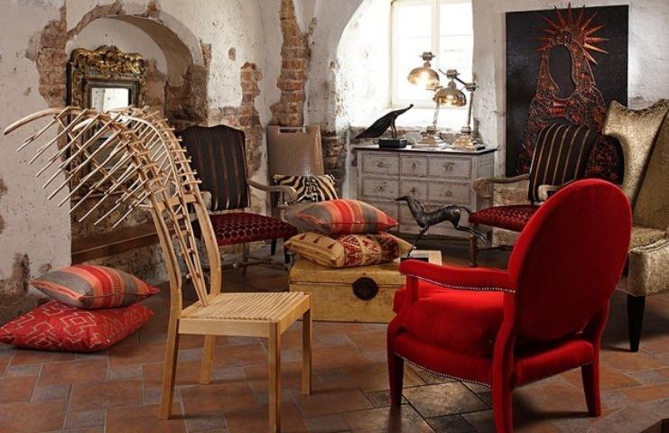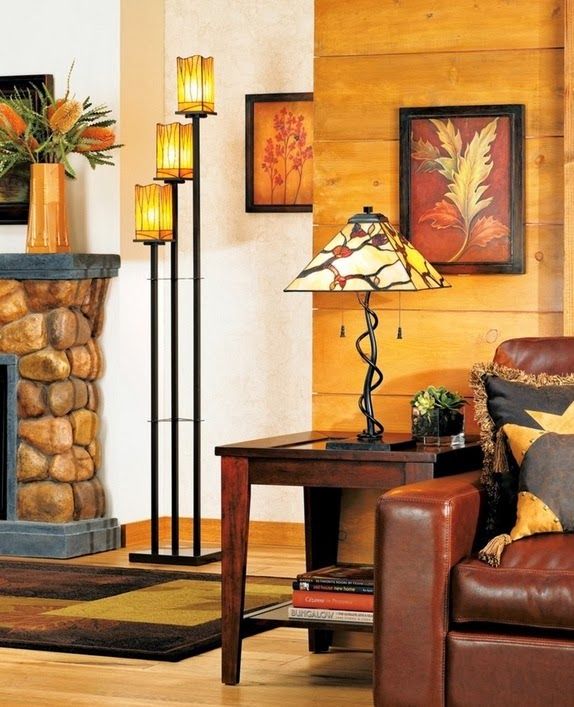Освещение в гостиной должно быть активным. Основное освещение требует крупной люстры стилистически соответствующей декору помещения. Если в гостиной есть рабочая зона, её необходимо выделить точечным освещением. Осветительные приборы для гостиной выбираются с особой тщательностью, поскольку они создают завершающий декоративный акцент. Больше остальных подойдут модели люстр, настольных и настенных ламп выполненные из тонких извилистых металлических прутьев и крупных плафонов из разноцветного стекла.