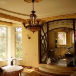 Оформление осветительных приборов в стиле модерн сразу выделяется из общего ряда люстр, светильников и бра. Как правило, они имеют ни на что не похожую замысловатую форму и сочетают в себе металлические конструкции, тонкий фарфор, дерево, цветные пестрые стекла и другие характерные особенности стиля. Замысловатые формы с ассиметричными линиями, не лишенные изящности — определяет осветительные приборы всех видов, выполненные в стиле модерна. При создании интерьера актуальны торшеры, имеющие металлическую или деревянную основу с хрупким капельным стеклом (стекло с пузырьками воздуха внутри). Крайне важно, что бы основа торшера, будь то металл или дерево, максимально подходили по цвету и текстуре к уже использованному в интерьере материалу. Для целевого освещения используются настольные светильники имеющие нестандартные изгибы с крупным бесформенным или эллипсовидным плафоном. Настольный светильник может выступать в роли аксессуара, если он выполнен из яркого стекла, подходящего по цвету и тону к общему интерьеру. Для основного освещения подойдут изящные канделябры с плетеными извилистыми узорами. Они хорошо дополнят классическое исполнение стиля модерн с большим количеством деревянных покрытий и декоративных элементов.