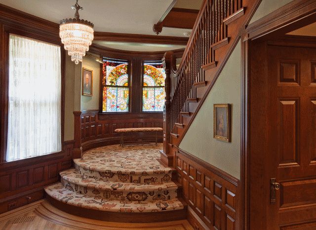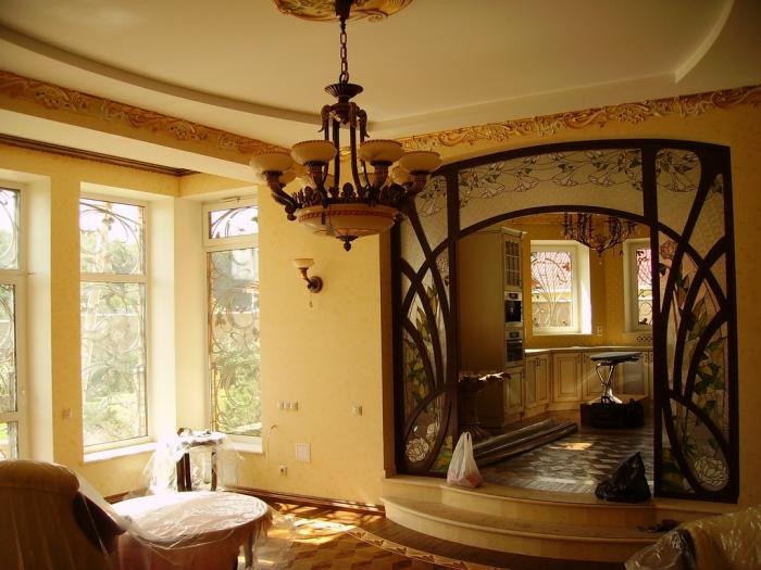 Стекло в стиле модерн имеет несколько функций. В первую очередь, с помощью этого материала вводятся основные, контрастирующие с общей цветовой гаммой, элементы. Цветные мозаичные рисунки на окнах дают дополнительное рассеянное освещение, которое наполняет общий интерьер, оформленный в тусклых тонах, цветными бликами. Вторая особенность данного материала связана с историей создания стиля. Модернизм – это первое стилистическое движение, которое начало широко использовать такой материал как стекло в декоративных целях. Применение материала может быть настолько разнообразным, насколько разнообразен сам стиль модерн. Стеклянные столы, перегородки, двери и любые декоративные элементы, вплоть до картин определяют стилистику модернизма.
