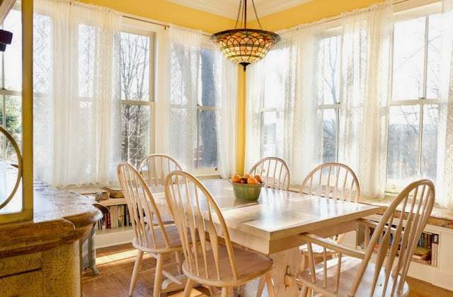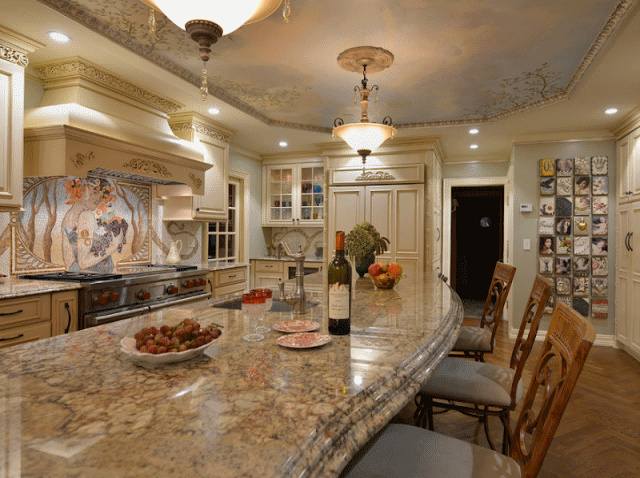 Освещение для кухни должно быть двух видов: фоновое и целевое. Фоновое освещение равномерно распределяется на потолке. Целевое освещение устанавливается в кухонный гарнитур. Если кухня имеет не большой размер, можно использовать только фоновое освещение. По требованиям стиля окна должны иметь размытую округлую форму, но добиться этого не так просто. Для этого необходимо изменить проектировку здания и заказать сложную оконную конструкцию. Более простой способ – безрамное остекление, геометрическую форму которого можно скорректировать с помощью штор.