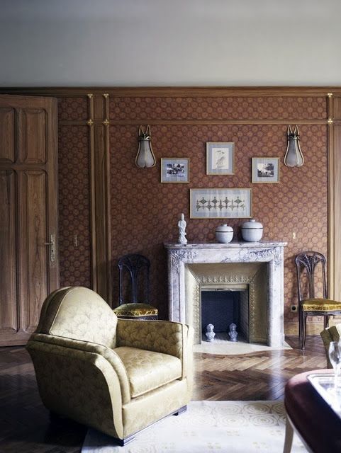 Текстиль – дополняющий материал, который используется в очень ограниченном количестве и четко по назначению. Портьеры, обивка для мягкой мебели и мелкие аксессуары, такие как диванные подушки и вышивка. Тяжелая и дорогая ткань для штор, которые дополняют оформление интерьера в стиле модерн, как правило, простой геометрической формы, четко подобранная в тон к цвету стен. В редких случаях шторы могут брать на себя роль цветового акцента, однако это выходит за приделы классического оформления стиля модерн. Подушки и обивка для мебели редко выступает в виде активного цветового элемента. Цвет ткани максимально дополняет и уравновешивает цвет мебели. Если в оформлении интерьера не достаточно изгибов, волнистых причудливых модернистских форм, то можно использовать ткань с узорами животного и растительного мира, выполненными в виде тонких одноцветных линий без резких, ярких цветных объектов.