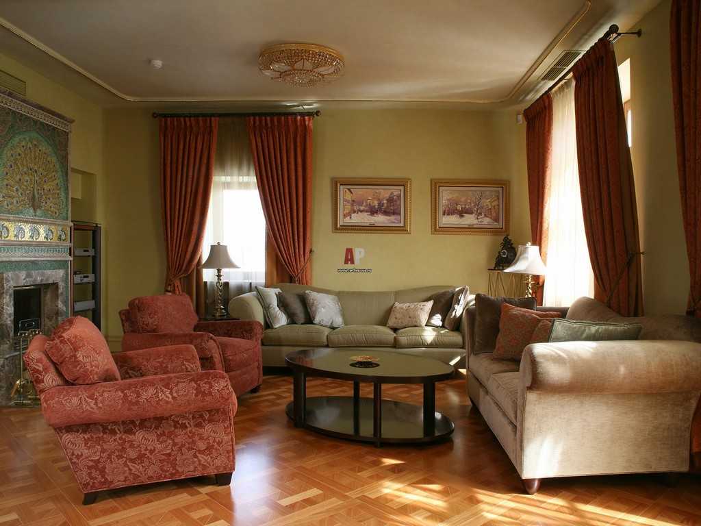 Крупные классические диваны из темного дерева и со светлой обивкой в комплекте с несколькими креслами, располагаются на небольшом однотонном ковре в центе гостиной. В обязательном порядке необходим стол, который будет иметь низкие широкие ножки из того же материала, что и деревянные части дивана, а так же крупную стеклянную или деревянную столешницу. Не редко находит применение пестрая мебель с пластиковыми покрытиями. Цвета стоит побираться исходя из основы, созданной фоном помещения. Важно учесть, что чем меньше мебели будет в гостиной, тем больше интерьер будет соответствовать стилистике модернизма.