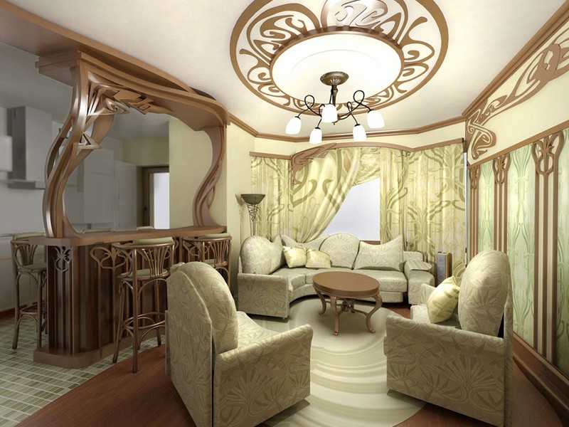 Оформление интерьера в гостиной требует глубокого проникновения в одну стилистику, в данном случае – модерн. Для создания камфорной обстановки необходимо сделать помещение максимально просторным, а так же особое внимание уделить декорированию и подбору цветовых гамм.