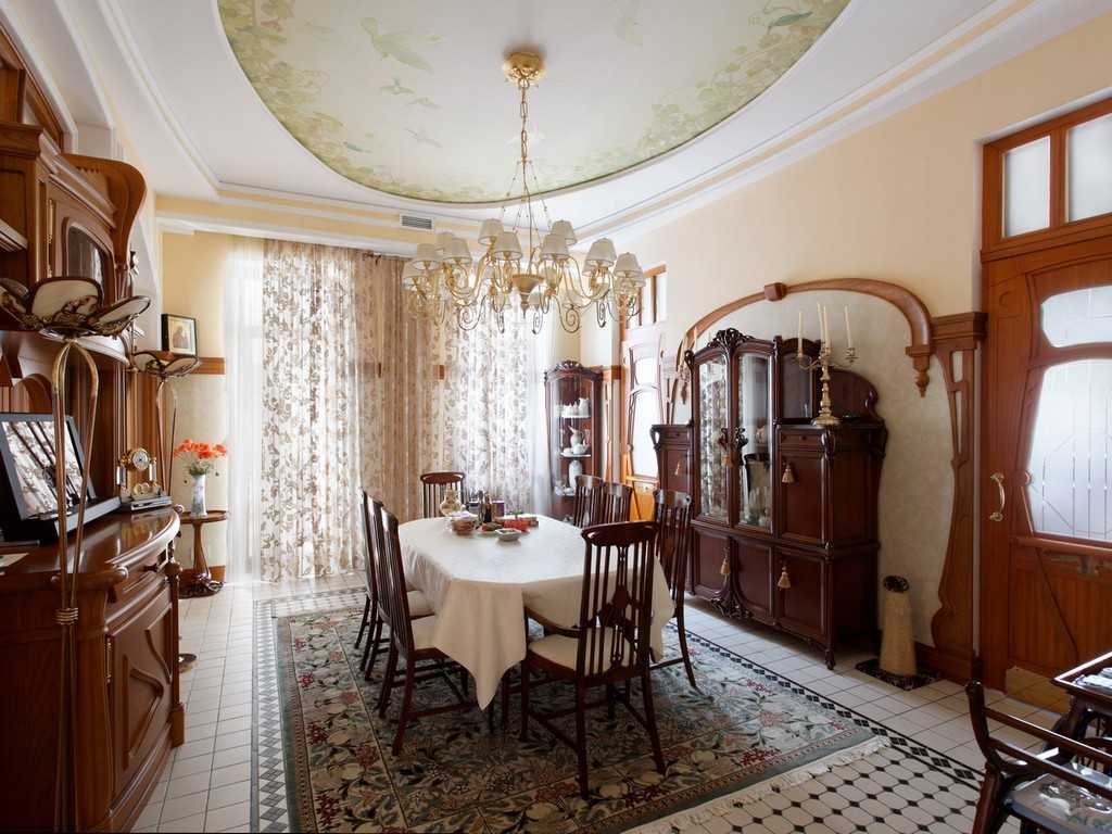 В классическом исполнении стиля модерн используется мягкий персиковый фоновый цвет, а в виде активного элемента – дерево или пестрая цветная мозаика с мягкими обтекаемыми формами. Дополнительные цветовые текстуры необходимы для того, что бы выделить роль материала в интерьере. Акцент на использование стекла, металла или дерева является определяющим в стилистике модерна. Цвет дополнительных текстур должен быть максимально выразительным, завершающим цветовой ансамбль фона и активных цветовых элементов. Если общий фоновый цвет и подобранный к нему цвет активного элемента имеют близкий к натуральному оттенок, то завершающим может послужить светлое дерево, мельхиор, мозаика на окнах из ярких округлых (овальных, бесформенных) разноцветных стеклышек. Когда для фона был использован цвет далекий от природного происхождения, то дополнительные цветовые текстуры должны быть холодными и темными: темное дерево, сталь (метал стального цвета), фарфор. Это добавит в характер интерьера резкости, что усилит цветопередачу.