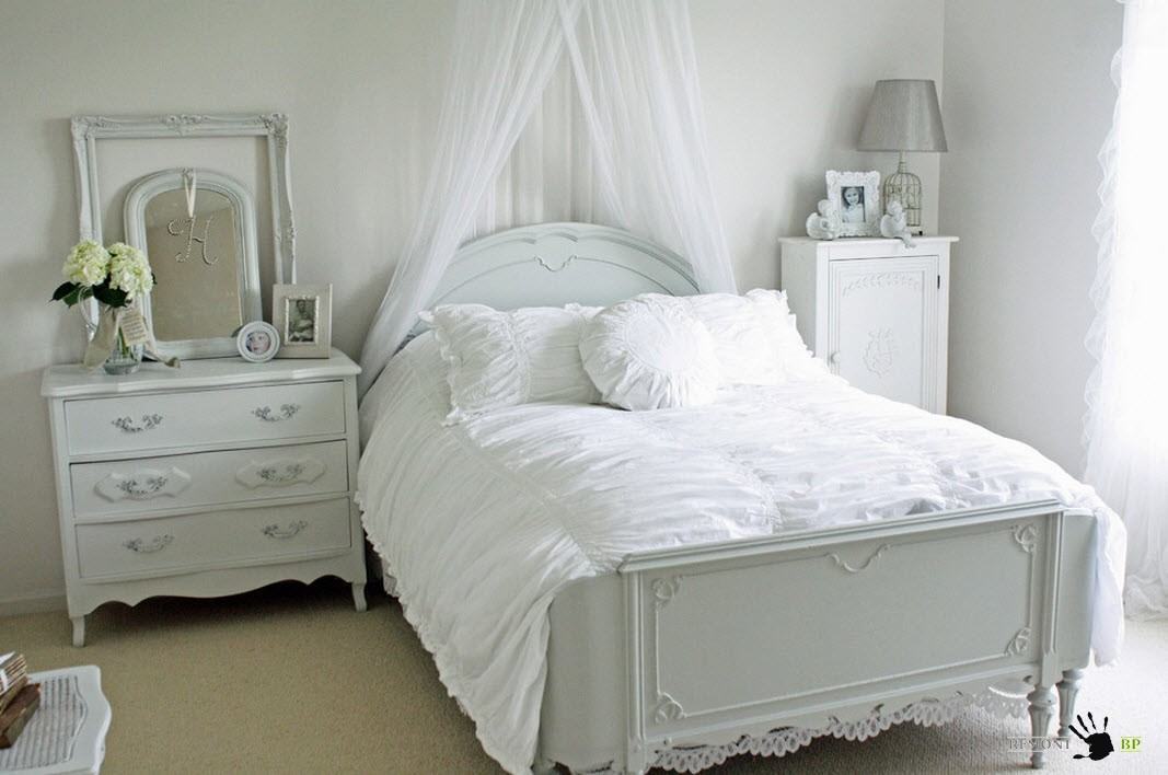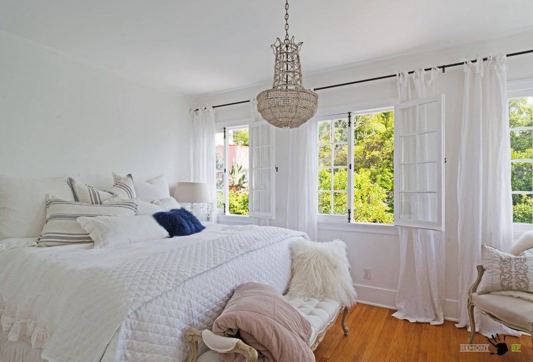 Если речь идет о декорировании спальни текстилем, то можно использовать исключительно белоснежную палитру, как для оформления спального места, так и для декора оконных проемов. Иногда для создания некоторого акцента, может применяться вышивка или аппликации на покрывалах, подушках и других предметах текстильного оформления.