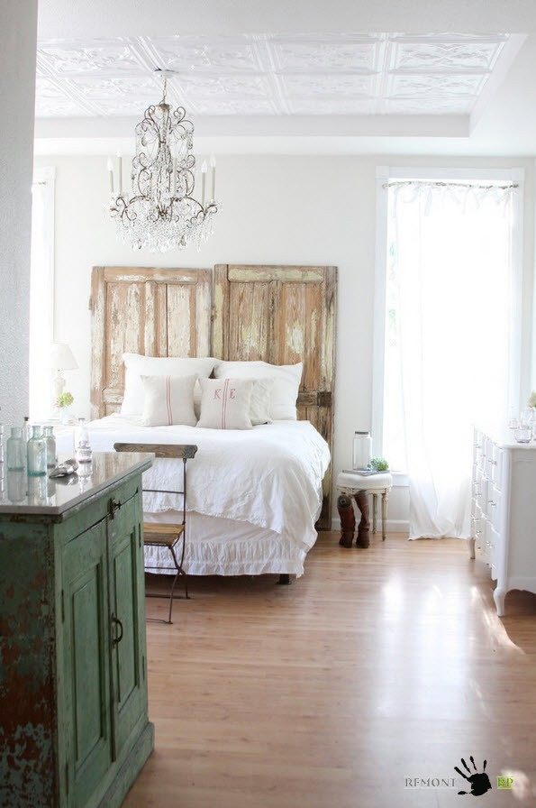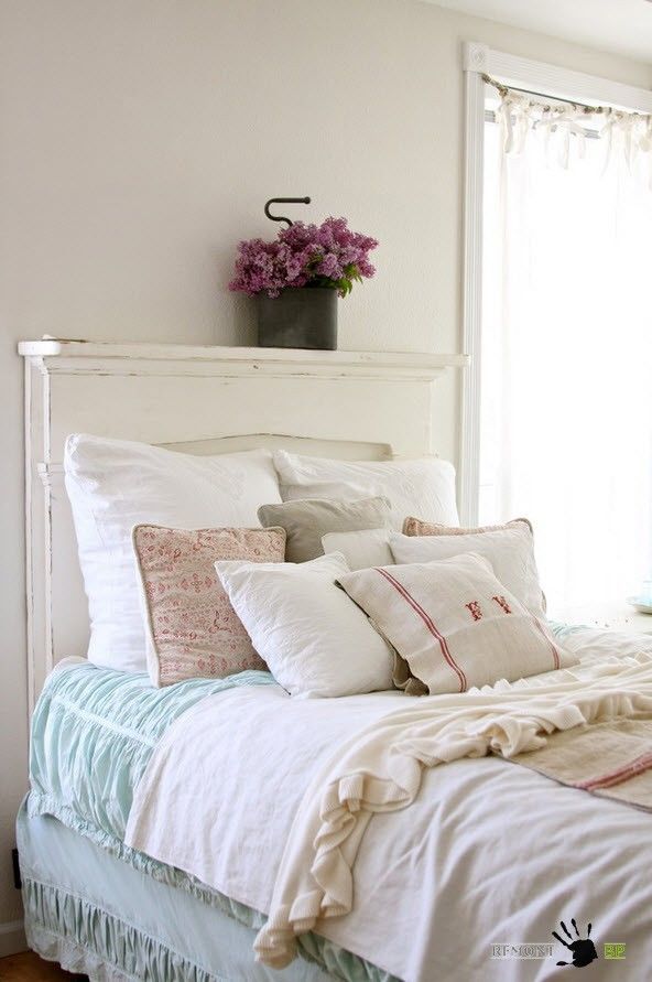 Спальня в стиле шебби шик – это светлое, можно даже сказать белоснежное, помещение с цветовыми акцентами в текстиле, декоративных элементах или частей меблировки. Большое внимание уделяется оформлению изголовья кровати. Именно в этом элементе интерьера дизайнеры любят применять креативность – использовать старые деревянные доски с потертой краской, оконные ставни, двери или другие конструкции, бывшие в употреблении.