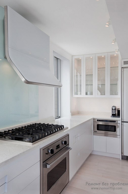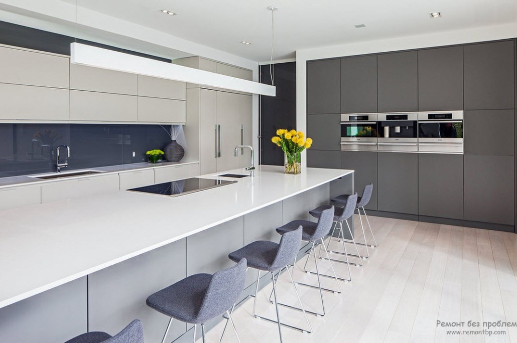В оформлении кухни предпочтение отдается инновационным материалам, строгим геометрическим формам, монохромным оттенкам, сочетанию металлических поверхностей и стекла. Такие кухни являются эффектными рамками для технических разработок, предназначенных для облегчения кухонного труда. Вся бытовая техника гармонично вписывается в общий интерьер и выставляется напоказ, являясь необходимой его частью.