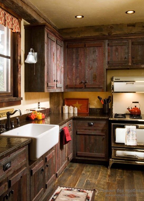 Особую ценность представляет ручная работа: подвесные резные полочки, скамейки, вязаная бахрома и вышивка на полотенцах. Необходимые кухонные детали стиля кантри: льняной текстиль и пестрый ситец (занавески, скатерть), многочисленные плетеные корзины и «деревенские» коврики, чугунные кастрюли и глиняная посуда. Мебельная литая фурнитура имеет грубоватый вид.