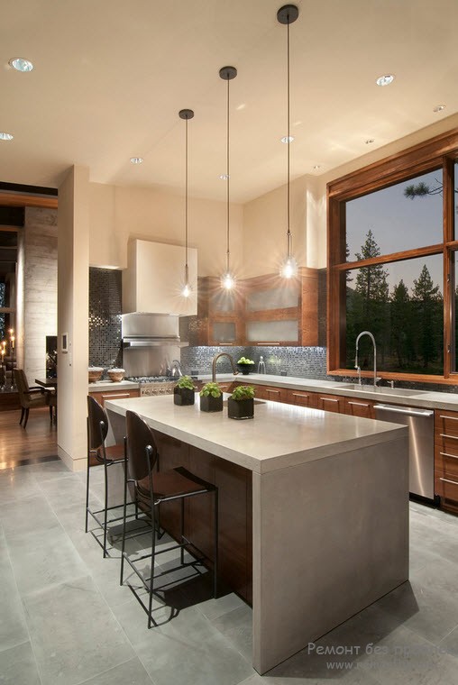 При оформлении кухонь в техно-стиле или hi tech архиважною задачей является правильное распределение освещения. Электрический свет должен создавать эффект простора. Одной люстрой здесь не обойтись. Точечные светильники предназначаются для рабочей зоны; светодиодная подсветка выделяет мебель и конструктивные элементы потолка; группа струнных светильников подвешивается над обеденной зоной. Софиты отлично гармонируют с интерьером техно-кухни. Для осветительных приборов выбираются плафоны самых простых форм: конус, шар или куб.