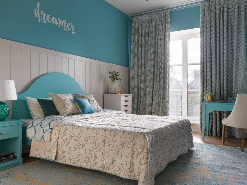 Поскольку в подобном примере оформления наблюдается преобладание белого и синего цветов, его часто называют «морским» и используют для обустройства мальчиковых спален. В такой комнате приемлемо использование балок на потолке и спального места в виде кровати-корабля с балдахином-парусами, однотонных обоев на стенах либо полотен с 3D изображениями морского дна, берега моря или острова. Занавески в такой комнате могут крепиться на деревянном карнизе либо кольцах. Актуальные аксессуары – аквариум с золотой рыбкой, фигурки кораблей, фотографии в деревянных рамках и прочая «морская» атрибутика.