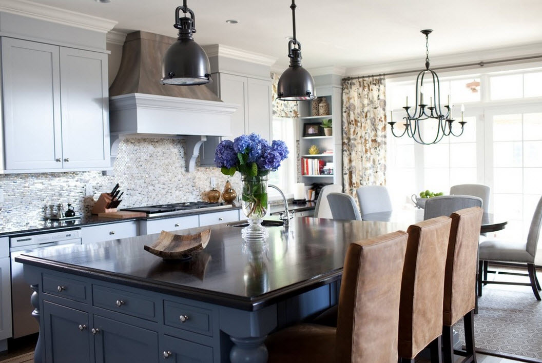 Света на кухне много не бывает априори и не надо сомневаться в том, что несколько источников – перебор. По мнению декораторов, из осветительных приборов лучше составлять дуэты, трио, и прозрачные гроздья стеклянных бус развешивать над обеденным столом. Композиционные группы, с филигранно исполненными элементами хрупкого декора, призваны со всех сторон освещать и украшать жизнь.